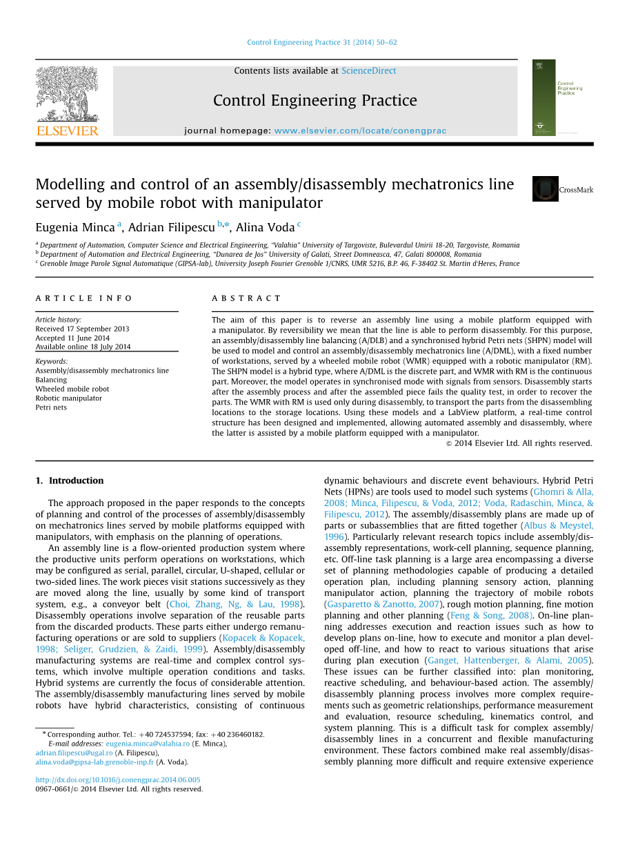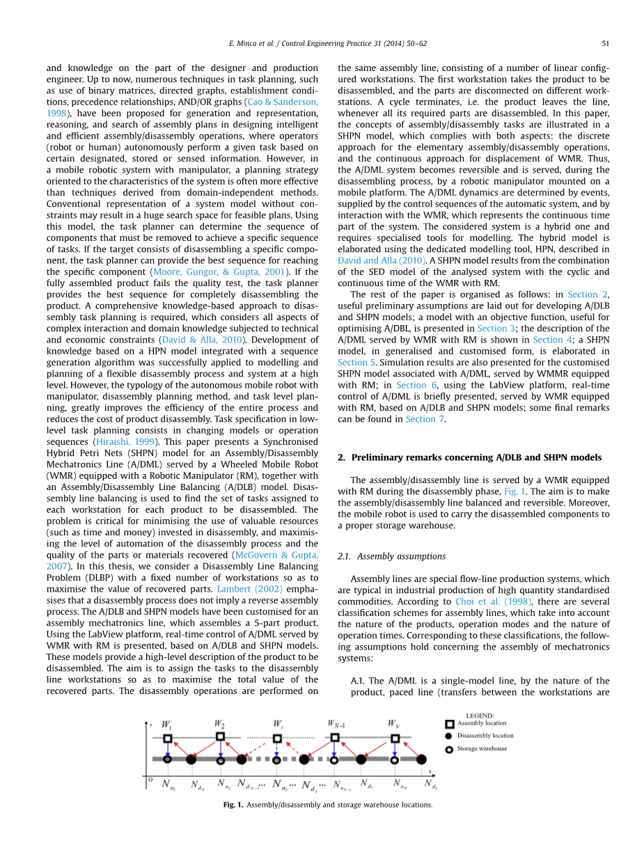 装配线是面向流的生产系统,其中生产单元在工作站上执行操作,工作站可以配置为串行,平行,圆形,U形,蜂窝或双面线。当工件沿着线移动时,工件连续地访问工位,通常是通过某种传输系统,例如传送带(崔,张,吴, amp; 刘,1998).拆卸操作涉及将可重复使用部件与废弃产品分离。这些部件要么进行再制造操作,要么出售给供应商(科帕切克amp; Kopacek 1998; Seliger, Grudzien, amp; 扎伊迪,1999 年).装配/拆卸制造系统是实时和复杂的控制系统,涉及多个操作条件和任务。混合系统目前是备受关注的焦点。由移动机器人提供的组装/拆卸生产线具有混合特性,由连续动态行为和离散事件行为组成。混合Petri网(HPN)是用于对此类系统进 行建模的工具(高姆里amp; 阿拉, 2008; Minca, Filipescu, amp; 沃达,2012;伏达,拉达钦,米卡, amp; 菲利普斯,2012).装配/拆卸计划由安装在一起的零件或子组件组成(阿不思 amp; Meystel 1996).特别相关的研究课题包括装配/拆卸表示,工作单元规划,顺序规划等。离 线任务计划是一个包含多种规划方法的大范围,能够制定详细的操作 计划,包括规划感官行动,计划机械手动作,规划移动机器人的轨迹(加斯帕雷托amp; Zanotto,2007年),粗糙运动规划,精细运动规划和其他规划(丰 amp; 宋,2008).在线计划解决执行和反应问题,例如如何在线开发计划,如何执行和监控离线开发的计划,以及如何应对计划执行期间出现的各种情况(Ganget, Hattenberger, amp; 阿拉米, 2005年).这些问题可以进一步分为:计划监控,反应式调度和基于行 为的操作。装配/拆卸计划过程涉及更复杂的要求,例如几何关系,性能测量和评估,资源调度,运动控制和系统规划。对于并行且灵活 的制造环境中的复杂装配/拆卸线,这是一项艰巨的任务。这些因素 的结合使得实际的装配/拆卸计划更加困难,并且需要丰富的设计师的经验和生产工程师的知识。到目前为止,在任务规划中有许多技术,例如二进制矩阵的使用,有向图,建立条件,优先关系,和/ 或图(曹amp; 桑德森 1998已经提出用于在设计智能和有效的装配/拆卸操作时生成和表示,推理和搜索装配计划,其中操作员(机器人或人)基于某些指定,存储或感测的信息自主地执行给定任务。然而, 在具有操纵器的移动机器人系统中,面向系统特征的规划策略通常比源自独立于域的方法的技术更有效。没有约束的系统模型的常规表示可能导致可行计划的巨大搜索空间。使用此模型,任务计划程序可以确定必须删除的组件序列,以实现特定的任务序列。如果目标包括反汇编特定组件,则任务规划人员可以提供到达特定组件的最佳顺序(摩尔,古戈尔, amp; 古普塔,2001年).如果完全组装的产品未通过质量测试,则任务计划员提供完全拆卸产品的最佳顺序。需要一种全面的基于知识的反汇编任务规划方法,该方法考虑了受技术和经济约束的复杂互动和领域知识的所有方面(大卫 amp; 阿拉, 2010).基于与序列生成算法集成的HPN模型的知识开发成功地应用于灵活的拆卸过程和系统的建模和规划。然而,具有机械手,拆卸计划方法和任务级别规划的自主移动机器人的类型,极大地提高了整个过程的效率并降低了产品拆卸的成本。低级任务规划中的任务规范包括改变模型或操作顺序(平石,1999).本文介绍了一种用于装配/拆卸机电一体化生产线(A / DML)的同步混合Petri网(SHPN)模型,该机型由配备机器人操纵器(RM)的轮式移动机器人(WMR)服务,以及装配/拆卸线平衡(A / DLB)模型。拆卸线平衡用于查找为每个要拆卸的产品分配给每个工作站的任务集。这个问题对于最大限度地减少在拆卸过程中投入的宝贵资源(如时间和金钱)的使用,以及最大限度地提高拆卸过程的自动化水平以及回收的零件或材料的质量至关重要(麦戈文 amp; 古普塔 2007).在本文中,我们考虑具有固定数量工作站的拆卸线平衡问题(DLBP),以便最大化恢复部件的价值。兰伯特(2002) 强调拆卸过程并不意味着反向装配过程。A / DLB和SHPN型号已针对装配机电一体化生产线进行了定制,该生产线组装了一个由5部分组成的产品。使用LabView平台,基于A / DLB和SHPN模型,提供了WMR与RM服务的A / DML的实时控制。这些模型提供了要拆卸产品的高级描述。目的是将任务分配给拆卸线工作站, 以便最大化恢复部件的总价值。执行反汇编操作相同的装配线,由许多线性配置的工作站组成。第一个工作站将产品 拆开,部件在不同的工作站上断开连接。只要所有需要的零件都被拆卸,一个循环终止,即产品离开生产线。在本文中,装配/拆卸任务 的概念在SHPN模型中进行了说明,该模型符合两个方面:基本装配/ 拆卸操作的离散方法,以及WMR位移的连续方法。因此,A / DML系统变得可逆并且在拆卸过程期间由安装在移动平台上的机器人操纵器提 供。A / DML动态由事件决定,由自动系统的控制序列提供,并通过与WMR的交互来确定,WMR代表系统的连续时间部分。所考虑的系统是 混合系统,需要专门的建模工具。混合模型使用专用建模工具HPN进 行详细说明大卫和阿拉(2010年).SHPN模型是由分析系统的SED模型与WMR与RM的循环和连续时间的组合得出的。