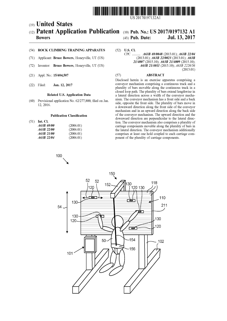 [0039] 图1是攀岩训练装置100(以下称为'装置')的一个实施例的示意性透视图。装置100包含一个驱动(例如转动)输送机构110的驱动器。在一些实施方式中,驱动器是诸如电机112(如图2和图3所示)的自动化驱动器,在另一些实施方式中,驱动器是诸如作用于使用者质量上的重力的手动驱动器。在本专利中,术语“电动机”一般指一种能为产品提供动力、施加或者是提供运动或动作的装置(例如电动机、磁动机、泵、驱动系统、引擎等)。输送机构110与框架102相连,以将输送机构110支撑在地面上方。在一些实施方式中,框架102包含可以安装在地面上的支脚,支脚的长度足以抵抗使用时施加在输送机构110上的倾覆力。在另一些实施方式中,框架102被安装到一个垂直的墙面(而不是地面或者地板)上,用以支持输送机构110。