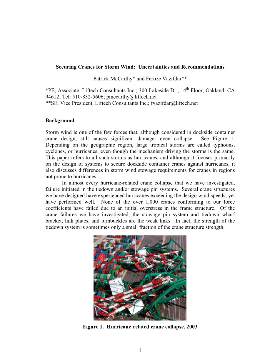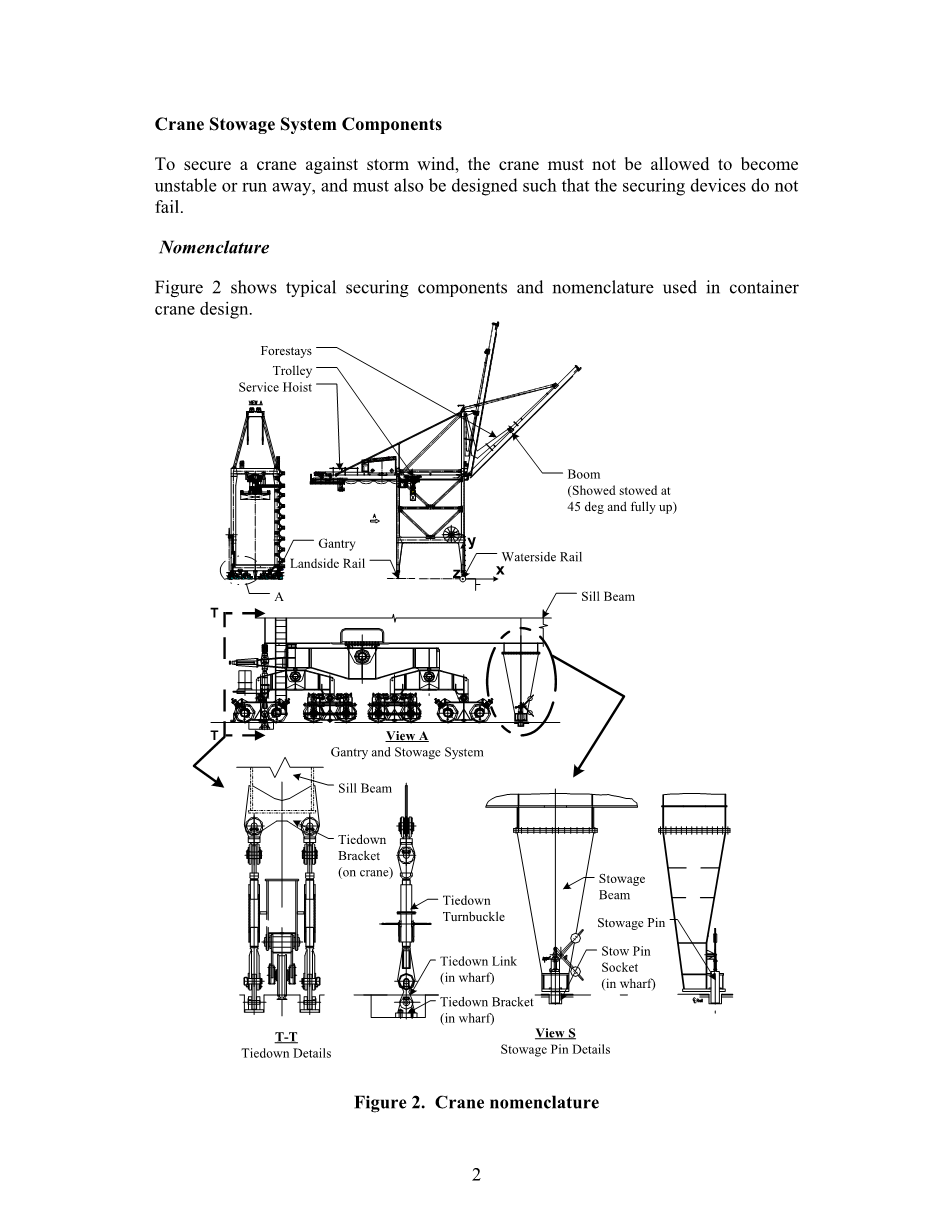 暴风是为数不多的破坏力之一,虽然在岸边集装箱起重机的设计中有所考虑,但仍会造成重大的破坏甚至倒塌。见图1。根据地理区域,大热带风暴被称为台风、旋风或飓风,尽管驱动风暴的机制是相同的。本文指的是所有这样的风暴,飓风,虽然它主要侧重于系统设计安全的岸边集装箱起重机防飓风,也讨论了在暴风地区中起重机的配载要求而不是倾向于飓风。我们研究发现,几乎在每一个飓风相关的起重机倒塌都在固定或配销系统启动中失效。一些起重机结构经历的飓风风速超过了设计风速,但都表现不错。由于框架结构的初始过应力,超过1000台符合我们力系数的起重机没有一台失效。在我们研究过的起重机故障中,积载销系统和联锁码头支架,链板和螺丝扣是薄弱环节。事实上,联系系统的强度有时只是起重机结构强度的一小部分。