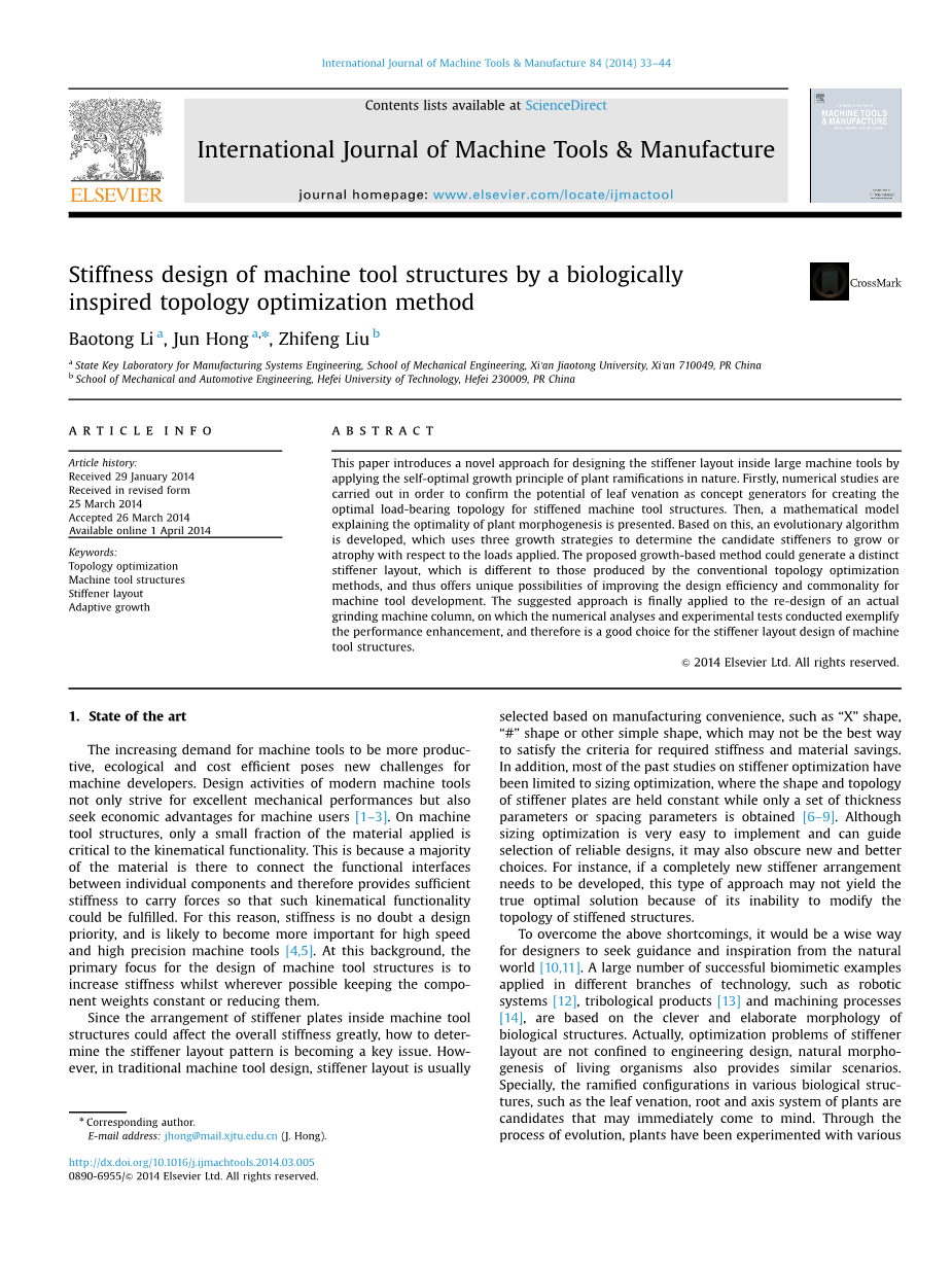 摘 要:本文介绍了一种利用自然植物优化自增长原理设计大型机床内部加强筋布局的新方法。首先,通过进行数值研究证实了叶片作为概念发生器的潜力,以创建加强型机床结构的最佳承载拓扑结构。然后,提出了一份数学模型以解释植物形态发生的最优性。在此基础上,发展了一种演化算法,该算法使用三种增长策略来确定候选加强筋相对于施加的载荷的增长或萎缩情况。根据所提出的基于增长的方法可以生成与传统的拓扑优化方法不同的加强筋布局,从而为提高机床开发的设计效率和通用性提供了独特的可能性。本文所提及的方法最终应用于实际磨床立柱的重新设计,并通过数值分析和实验测试进行了性能增强的例证,可见这是机床结构加强筋布局设计的更佳选择。