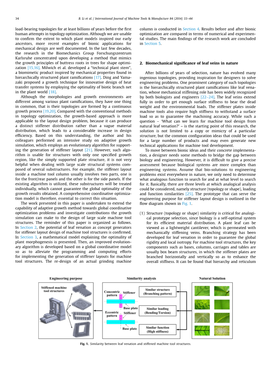 本文的研究问题是将自适应生长方法推广到全局协调优化问题中,并研究了生长模拟对大型机床结构设计的作用。本文的整体布局如下:在第2节中,证实了叶片纹理作为机床结构加强筋布局设计概念生成器的潜力。在第3节中,给出了一个解释植物形态建成最优性的数学模型。然后,在此模型的基础上,提出了一种改进的进化算法,从而减轻了机床结构加强筋布局设计的编程和计算工作。第4节对实际磨床立柱进行了重新设计。在数值和实验研究的基础上,比较了立柱仿生优化前后的结果。第5节总结了本文研究工作的主要结论。