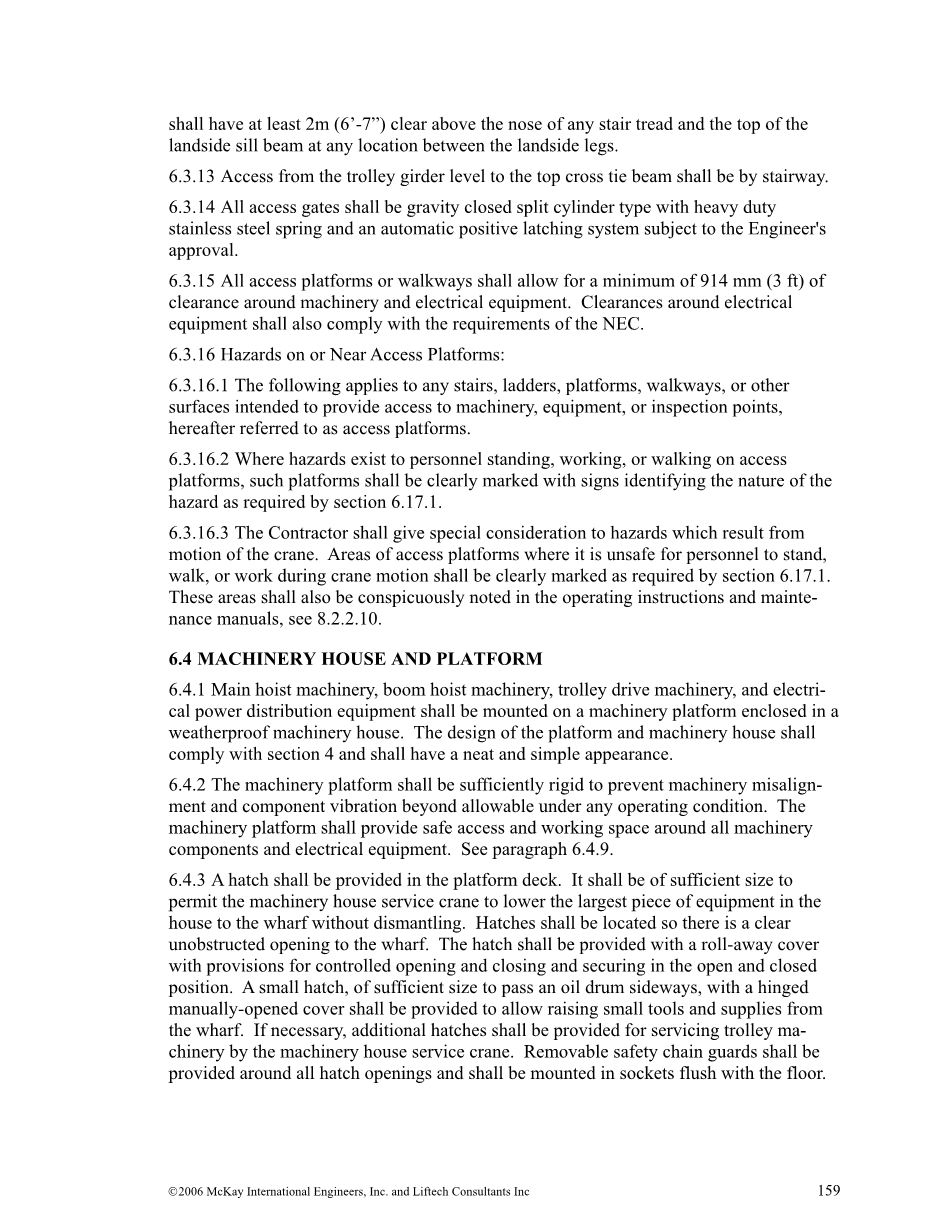 6.7.4后备区域应有一台桥式户外电动起重机,用于处理部件,并在通往码头水平时将其降低。桥梁横移和长行程运行以及服务起重机提升运动都将通电。起重机应能够将后部的任何部件从部件的安装位置提升至码头,并从码头提升至安装位置,而无需将部件从维修起重机上卸下。至少应该由起重机维修保养液压系统和滑车绳张紧器液压系统的区域,包括液压缸,滑轮和动力装置。当小车处于后退极限位置时,维护起重机还应能够接近小车和陆上悬链手推车上的所有机器。维修起重机应能在整个起重机行驶范围内由行人通道和维修平台内的人员安全控制。维护起重机应有一个确定的存放位置,以便在不使用时可靠地固定维护起重机,挂钩和控制器。起重机应由工程师批准,并由德马格,通力或同等制造。应提供安全通道,以维护需要维护的后援维修起重机的所有区域。