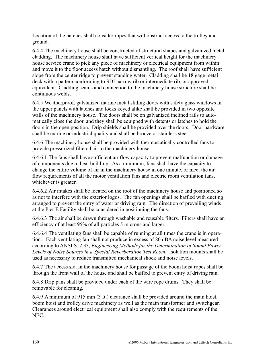 6.4.6.4通风机应始终能在起重机运行时运行。根据ANSIS12.33“确定特殊混响测试室噪声源声功率级的工程方法”测量,每台通风机不得产生超过80dBA的噪声。必要时应使用隔离安装座以减少传输的机械冲击和噪音水平。