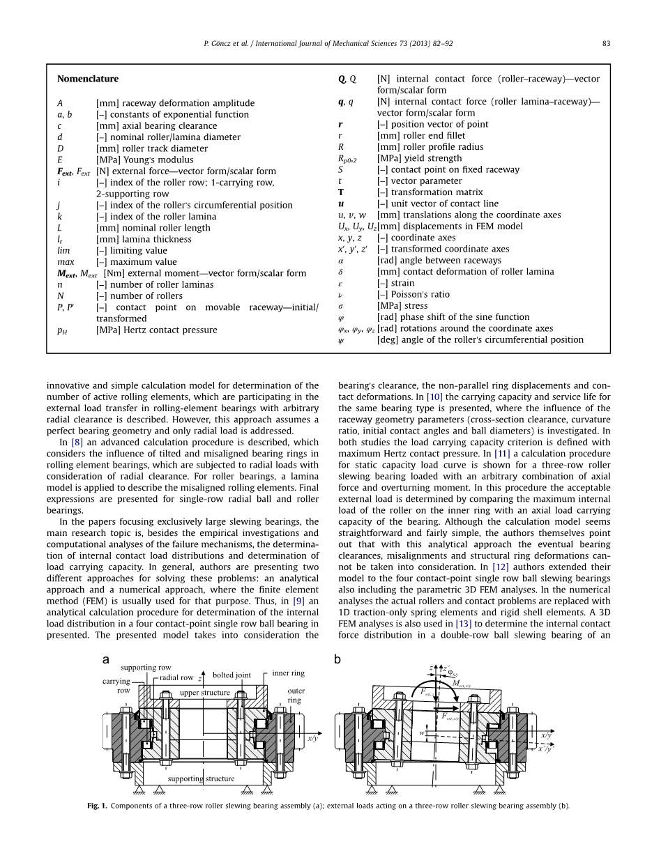 和预应力螺栓连接件(图1a)。 这种组件可以适应三种类型的载荷:轴向力(Fext,z),倾覆力矩(Mext,x / y)和径向力(Fext,x / y),前两个载荷是主要特征载荷 图1b)。 根据其实际应用情况,回转轴承的制造尺寸,类型和配置不同。 然而,三排滚柱式回转支承通常用于给定尺寸的最高负荷。它们有三个独立的滚子列,两个在轴向,一个在径向。 在大多数情况下(支撑安装),轴向负载较重的排是承载排(较大的辊) - 轴向力和倾覆力矩,而支撑排通常仅在转弯时才加载。