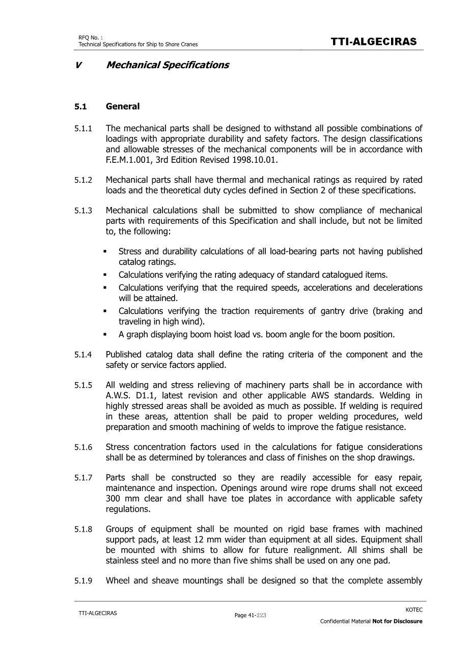 5.1.1 机械部件的设计应能承受所有可能的载荷组合,并具有适当的耐久性和安全系数。机械部件的设计分类和许用应力将符合F.E.M.1.001,第三版1998.10.01修订。