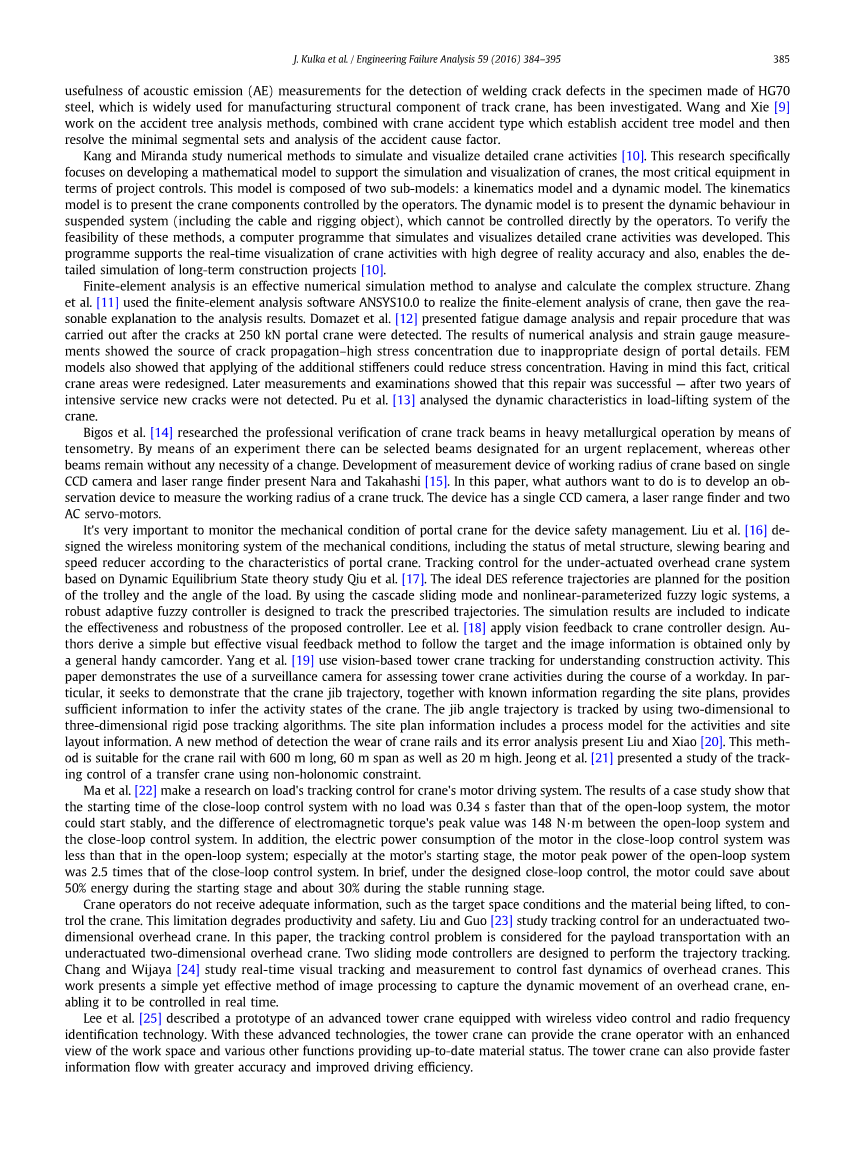 我们可以提出一些预防方法和控制措施的起重机事故在那些方面不安全的行为对象的人类,不安全状态和安全管理的缺陷。王et al。[8]处理无损评价结构部件的焊接裂纹缺陷跟踪起重机使用声发射技术。在这项研究中, 有用的声发射(AE)测量的焊接裂纹缺陷的检测标本HG70做的钢材,广泛用于制造跟踪起重机结构的组成部分,已被调查。王、谢[9]事故树分析方法,结合起重机事故类型,建立事故树模型解决最小的节段性因素集和分析事故原因。康和米兰达研究数值方法来模拟和可视化详细起重机活动[10]。