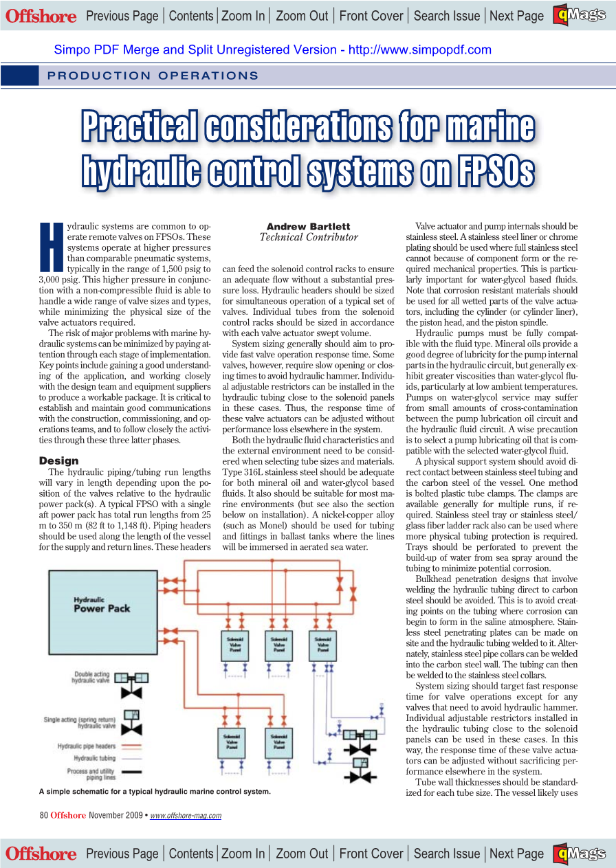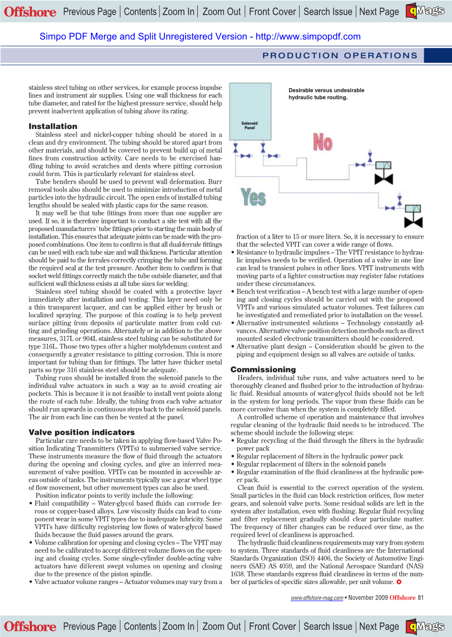 液压管路/油管的运行长度很大程度上取决于阀门相对于液压动力装置的位置。一个典型的海上石油工厂的船尾动力装置跨越的范围从25m到350m(82英尺至1148英尺),所以应该在船上供应线和返回线上使用管头,这些管头可以提供信号给电磁控制机架,确保系统有适当的流量,并且没有很大压力损失。液压头应该具有合适的大小使之能同时操作的一组特殊的阀门。电磁管控制架上的独立管的大小应与每个阀门执行机构的容积排量一致。