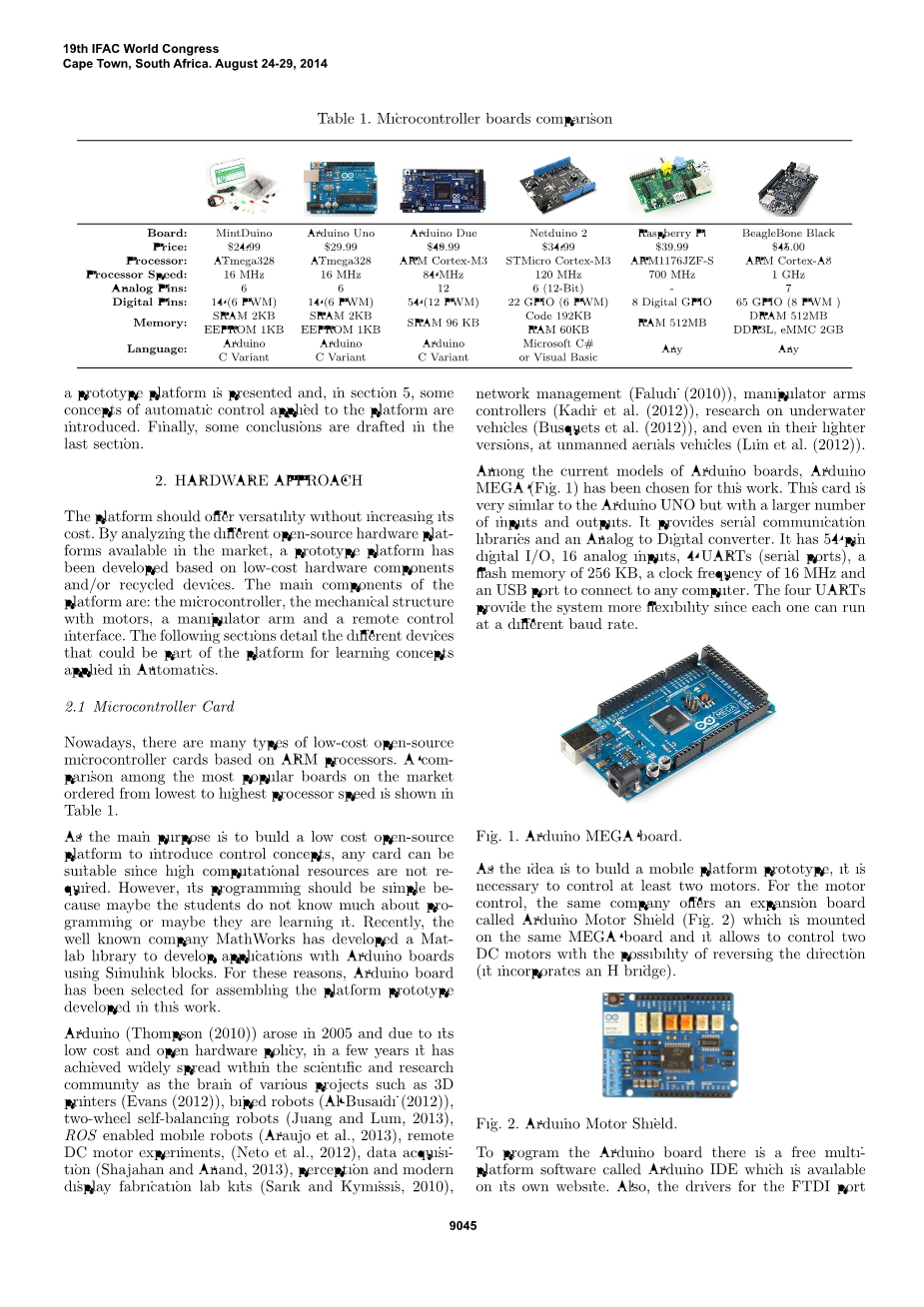 Arduino(Thompson(2010))于2005年出现,由于成本低廉且采用开放硬件政策,几年来在科研界广泛传播,作为3D打印机等各种项目的大脑(Evans(2012) ),双足机器人(Al-Busaidi(2012)),两轮自平衡机器人(Juang和Lum,2013),ROS启用移动机器人(Araujo等,2013),远程直流电动机实验(Neto et 2012年),数据采集(Shajahan和Anand,2013),感知和现代显示制作实验室套件(Sarik和Kymissis,2010),网络管理(Faludi(2010)),操纵臂武器控制器(Kadir et al。 (2012)),水下航空器的研究(Busquets等人(2012)),甚至是在无人驾驶飞行器上的较轻的版本(Lim et al(2012))。