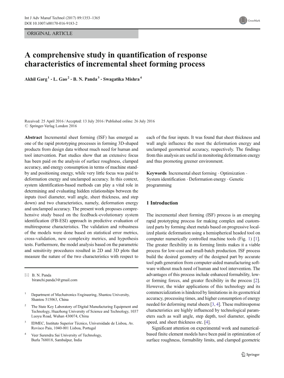 本研究提出了基于反馈的进化系统识别[FB-ESI]方法。该方法是综合利用两种理论的方法,量化多响应特征的过程。多响应特征包括变形能和松开的几何精度。输入主要考虑如下几点,薄板厚度、工具直径、壁角度。分析和确认模型形成的每一个特点,并具有可以同时对每个执行表面进行定量关系的分析得出结果和监控的两个特点。