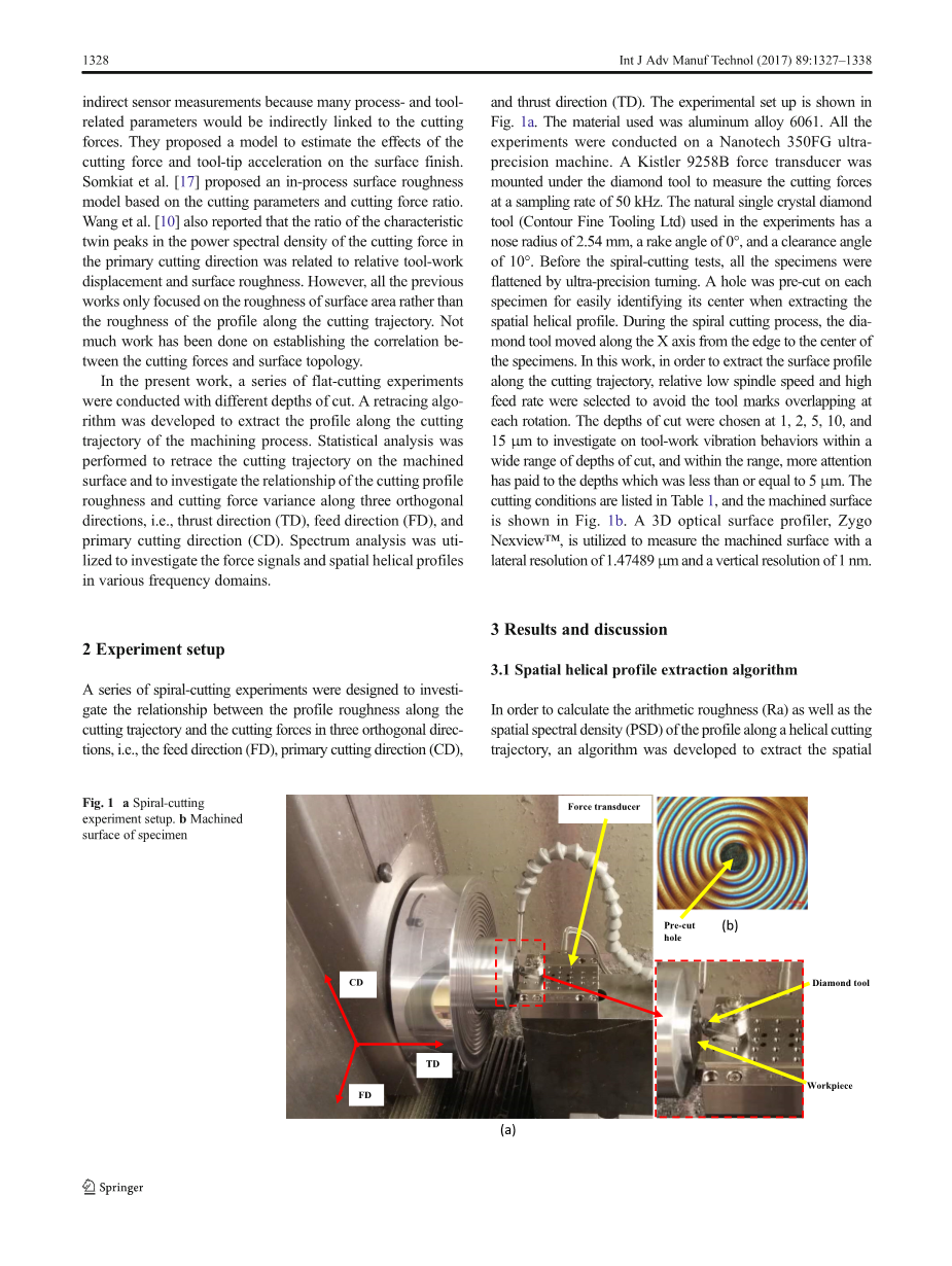 设计了一系列螺旋切削实验,用于研究切削轨迹上的轮廓粗糙度与切削力之间的三个正交方向上的关系,即进给方向(FD),主切削方向(CD)和推力方向(TD)。实验设置如图1a所示。所使用的材料是铝合金6061.所有实验在Nanotech 350FG超精密机器上进行。将Kistler 9258B力传感器安装在金刚石工具下方,以50kHz的采样速率测量切削力。在实验中使用的天然单晶金刚石刀具(Contour Fine Tooling Ltd)具有2.54mm的刀尖半径,0°的前角,以及10°的后角。在螺旋切割试验之前,所有的样品通过超精密车削被压平。在每个样品上预先切割孔,以便当提取空间螺旋轮廓时容易地识别其中心。在螺旋切割过程中,直径工具沿着X轴从样品的边缘移动到中心。在这项工作中,为了提取沿着切割轨迹的表面轮廓,选择相对低的主轴速度和高进给速率,以避免每次旋转时刀具标记重叠。选择切削深度为1,2,5,10和15mu;m,以研究在宽切削深度范围内的刀具振动行为,并且在该范围内更多地注意到深度较小大于或等于5mu;m。切削条件列于表1中,加工表面如图1所示。 1b。使用3D光学表面轮廓仪Zygo Nexview TM来测量加工表面,其横向分辨率为1.47489mu;m,垂直分辨率为1nm。