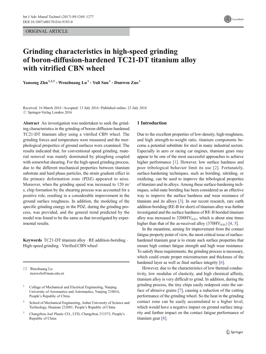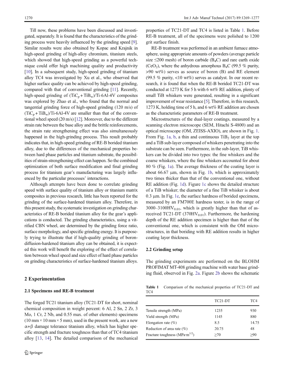 由于低密度、高韧性、高强度重量比的优异性能,钛合金在许多工业部门中成为钢材的潜在替代品。特别是在航空发动机或赛车发动机,钛齿轮似乎是实现更高的性能的最成功的方法之一。然而,低的表面硬度和低的摩擦学行为限制了它的使用。幸运的是,表面强化技术,如渗硼、渗氮、或氧化性,可用于改善钛及其合金的摩擦学性能。这些表面强化技术中,固体渗硼是提高钛及其合金表面硬度和耐磨性能的有效途径。在我们最近的研究中,对稀土渗硼(简称RE-B)钛合金进行了进一步的研究和渗硼钛表面合金硬度增加到3200HV0.01,比接收的合金(370HV0.01)高出了9倍。同时,从改善接触疲劳性能的角度来看,表面硬化钛齿轮的最关键的问题是创建这样的表面特性,以确保高接触疲劳强度和高耐磨性。为了满足这些要求,磨削过程是必要的,它可以创建适当的微观结构和厚度的硬化层,以及最终的表面完整性。然而,钛合金由于导热系数低、弹性模量低、化学亲和性强等特点,使其难以磨削。此外,在磨削过程中,微小的芯片很容易转存到磨粒表面,导致减少砂轮切削的