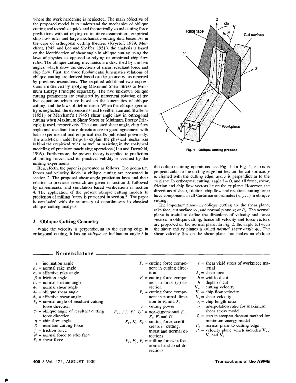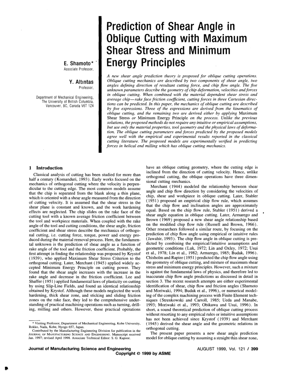 本文提出一种新的剪切角预测模型,用于倾斜切削,假设一个直的薄剪切带,其中加工硬化被忽略。所提出的模型的主要目的是理解倾斜切削的力学,并实现快速和理论上可靠的切削力预测,而不依赖于直观假设,经验切屑流规则和大机械切削数据库。如在正交切削理论的情况下(Krystof,1939;Merchant,1945;和Lee和Shaffer,1951),该分析基于使用物理定律的倾斜切削中的剪切角的判断,而不是依赖于经验切屑流规则。倾斜切削力学由五个角度描述,其显示出剪切、合力和切屑流动的方向。首先,倾斜切削的三个基本运动学关系是基于几何形状,这和以前的研究人员报告的一样。通过分别应用最大剪切应力或最小能量原理得到所需的附加两个表达式。通过基于倾斜切削的运动学和变形定律的五个方程的数值解来评估五个未知的倾斜切削参数。当忽略倾斜几何时,当分别使用最大剪切应力或最小能量原理时,表达式导致正交切削中的Lee和Shaffer 1951)或Merchant(1945)提出的剪切角定律。模拟剪切角、切屑流动角和合力方向与以前公布的实验和经验结果基本一致。分析模型有助于解释经验规则背后的物理机制,以及协助精密加工操作的分析建模(Liu和Dornfeld,1996)。此外,本理论应用于预测铣削力,并且其实际有效性通过铣削实验来验证。