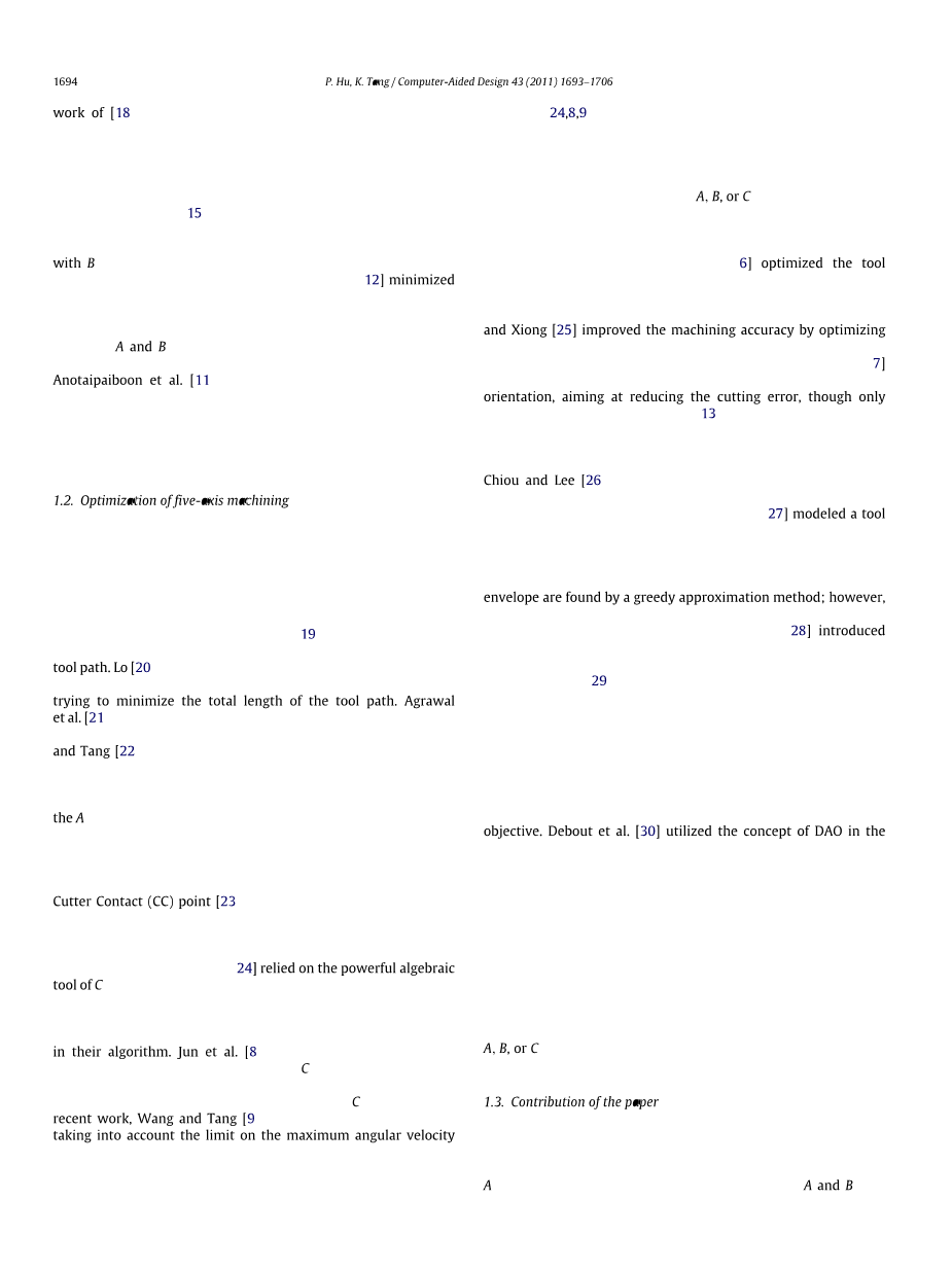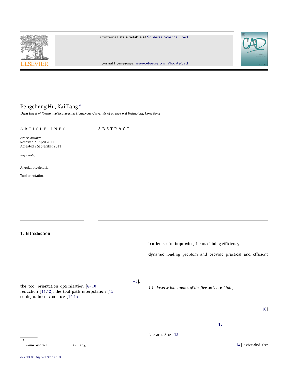 在过去15年左右的时间里,有大量的研究对五轴加工中的各种优化感兴趣。然而,这些优化主要是为了改进加工效率或加工精度零件坐标系。在刀具轨迹的规划中(也称为刀具接触曲线),Suresh和Yang提出了这一概念目的在于保持等扇贝高度的等扇贝刀具路径。Lo通过自适应选择进一步扩展了该思想以平端刀具的刀具倾斜度,同时尝试最小化刀具路径的总长度。阿格拉瓦尔等[21]通过选择合适的刀具路径,使刀具路径的长度最小化使用遗传算法(GA)的主路径方向。王和唐]提出了一种基于关于所谓的iso二次曲线概念在零件表面发现锥,以产生刀具接触曲线,减少角速度和角加速度A轴归零。不幸的是,他们的算法只适用于在主轴上有两个旋转轴的特定五轴机床。然而,在刀具路径中的刀具方向规划中,大多数现有的方法选择固定定向实践,即工具方向相对于切割器接触点。这种不灵活的缺点是严重的缺点是,对于具有高曲率的零件表面刀具方向经常要经历剧烈的变化在旋转轴上产生大的角速度和加速度机器。Morishige等人依赖于强大的代数用于确定刀具方向的C空间刀具,其中得到的刀具方向在无碰撞条件下得到进一步的平滑;然而,一些重要的局部几何不考虑局部刨削等特性在他们的算法中。Jun等人 通过添加C空间中的局部无凿槽约束;此外解决了工具方向发生巨大变化的问题提出了在C空间中平滑刀具方向的方法。在他们的最近的工作,王、唐也走了一步考虑最大角速度的限制并给出了详细的刀具轨迹生成需要一个系统框架将其编织在一起的算法所有必要的考虑,如避免碰撞、局部刨削和刀具的角速度。尽管如此[中的工作是根据零件坐标完成的独立于特定机器的系统(PC),因此容易引起机器的沉重动态负载旋转轴众所周知,刀具上的刀轨是光滑的方向(但仅以个人电脑为单位)可能会欺骗特定五轴机床A、B或C轴上的严重角加速度。除此之外,还有很多尝试以不同的目标和不同的技术。Lavernhe等人优化了工具每个CC点的方向,旨在找到最佳运动参数,从而减少高速加工中的编程和实际进给速度。耶熊通过优化提高了加工精度几何加工参数,如刀具方向,刀具形状,工件设置。Ho等[七]使用四元数插值方案平滑工具定向,旨在减少切割误差在PCS中,Fleisig和斯彭斯使用了连续样条函数近似刀具位置和方向接近恒定进给速度,减小角加速度;不幸的是,插值是在PCS中执行的。Chiou和Lee寻找基于关于扫掠包络方法,考虑了局部凿槽和全球碰撞。Kim和Sarma建立了一个工具模型路径作为向量场的流线通过选择CC点的最佳方向机器旋转电机速度限制和尖点高度限制和最佳性能方向封套是用贪婪近似法找到的,但是,这个非常复杂的系统没有实现,也没有具体的提供与机器相关的解决方案。赵介绍地板、墙壁和天花板的概念,用于确定最佳的局部无凿槽刀具方向,尽管最近在PC中,卡斯塔涅蒂等人引入了一个有趣的领域概念容许方位(DAO)的每个CC点的刀具方向。DAO最初是定义好的作为一个矩形然后变成一个不规则的特定机床坐标系(MCS)中的区域随后用四边形逼近。中的每一点四边形表示关联的CC点。然后可以直接在四边形以找到所需的最佳刀具方向目标。Debout等人在特定制造的刀具方向平滑过程-自动纤维放置-虽然不能扩展到
