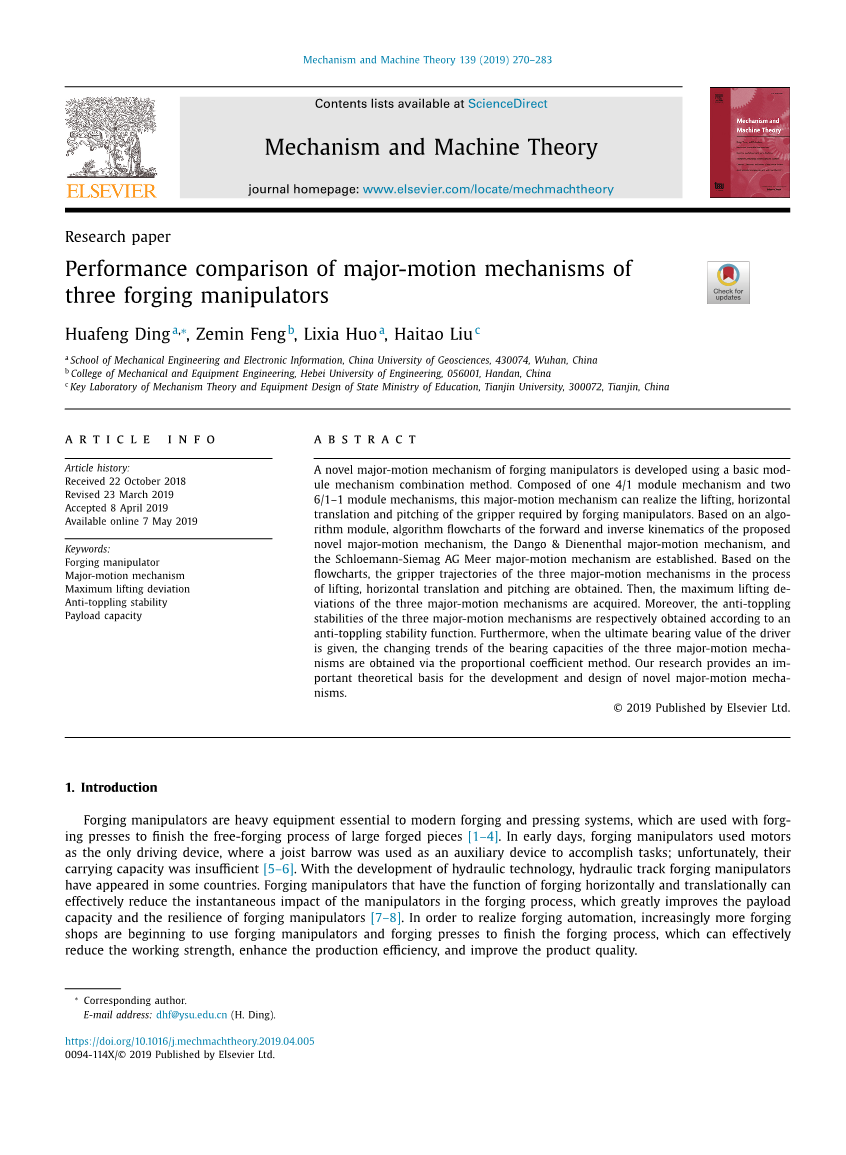 整个论文安排如下。在第二节通过模块机构组合的方法,开发了一种新型的锻造机械手主运动机构。提出了算法模块和算法流程图。同时,给出了与流程图中的特征有关的计算功能,并提供了三种主要运动机制的单独流程图。在第三节根据上述流程图和计算功能,获得三种机构在提升,水平平移和俯仰过程中使用的抓具的运动轨迹。然后,分析并比较了三种机构的最大提升偏差。在第4节提出了一种新型的抗倾覆稳定性函数,并对三种机理的稳定性进行了分析和比较。在第5节,当给出驱动器的极限轴承值时,可通过现有的比例系数方法针对不同的俯仰角获得三种机构的承载能力。