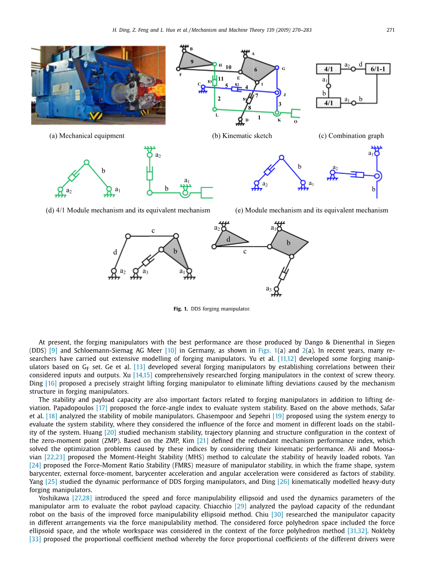 锻造机械手的稳定性和有效载荷能力也是影响其起重性能的重要因素。帕帕多普洛斯[17]提出了力角指标来评估系统的稳定性。基于上述方法,Safar等人[18]分析了移动机械手的稳定性。加森博尔和塞佩里[19] 他们提出了使用系统能量来评估系统稳定性的方法,其中他们考虑了不同负载下的力和力矩对系统稳定性的影响。黄[20]研究了零力矩点(ZMP)范围内的机构稳定性,轨迹规划和结构配置。基于ZMP,Kim[21] 定义了冗余机构性能指标,通过考虑它们的运动学性能解决了这些指标引起的优化问题。阿里和穆萨维亚[22,23] 提出了力矩高度稳定性(MHS)方法来计算重载机器人的稳定性。严[24]提出了机械臂稳定性的力矩比稳定性(FMRS)度量,其中将框架形状,系统重心,外力矩,重心加速度和角加速度视为稳定性的因素。杨[25] 研究了DDS锻造机械手的动态性能,丁[26] 运动学模型的重型锻造机械手。