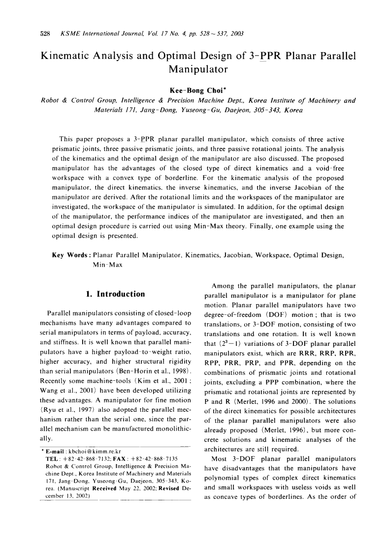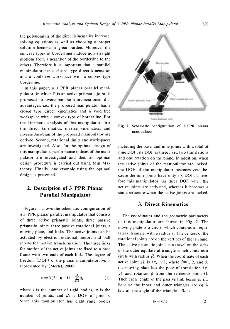 并联机器人组成的闭环有许多优势,比串联机器人有更高的精度和刚度。众所周知,并行比串联机器人有更高的有效载荷重量比、更高的精度和较高的结构刚度。最近一些机床已开发利用这些优点,机械手的精细运动的全钢载重子午线也采用并行机制,从平价等位基因机制制造单片机。并联机器人中,平面并联机器人是平面机械手运动。平面并联机器人有两个自由度(DOF)的运动;这是两个自由度的运动和一个旋转的运动。这众所周知,平面三自由度并联机器人的存在,RRP,RPR,RPP,PRR,PRP,和PPR,取决于棱柱形接头和旋转的组合接头,不包括PPP的组合,其中棱柱和旋转接头由P和R。解决方案的直接运动学系统架构的平面并联机器人进行了已经提出了,但更多的控制—克里特岛的解决方案和运动学分析架构要求。大多数的3-DOF平面并联机器人有手有缺点复杂的直接运动学多项式类型和无用的空隙小工作区以及凹型边界。直接运动学多项式的增加,求解方程以及选择合适的溶液变成一个巨大的负担。此外,凹型边界诱导非直从邻居的运动边界其他人。因此,一个并行的是很重要的机械手具有封闭式直接运动学和一个凸型空隙泰伊工作区边缘。在本文中,一种3-PPR平面平行机器人,其中P是一个活跃的棱柱关节,提出了克服上述的缺点,即该机器人有一个封闭式直接运动学和无空隙随着边界的凸式空间。该机械手的运动学分析,首先直接运动学,逆运动学,该机器人逆雅可比矩阵派生的。第二,旋转限制和工作区进行调查。同时为优化设计该机械手的操作,性能指标机器人进行了研究并优化设计方法是使用最小最大值进行理论。最后,一个例子使用最佳的的设计方法。