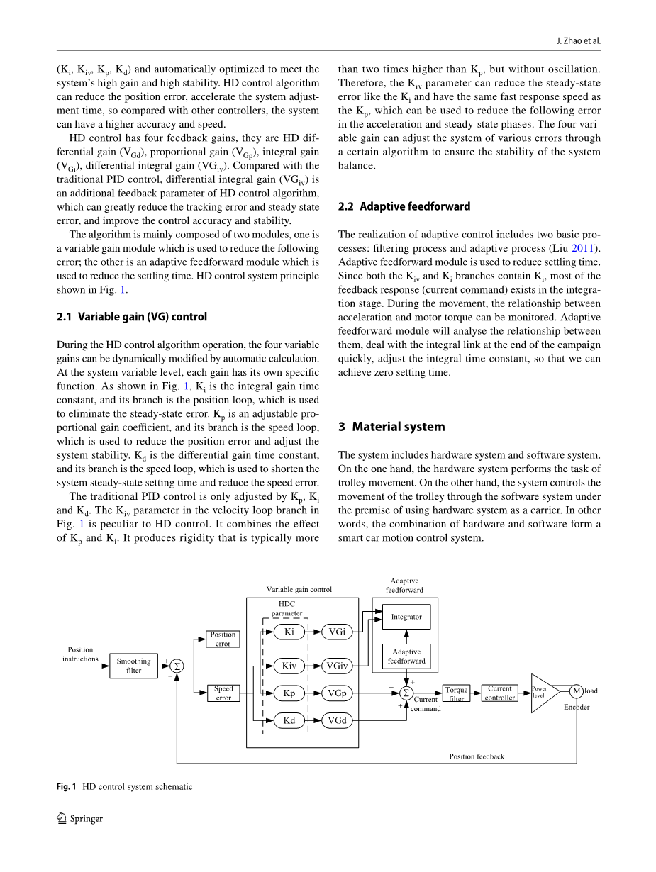 时至今日,传统的PID控制技术在工业领域仍占有不可替代的地位,相关的研究也很多。然而,传统的PID方法越来越不能满足复杂系统的要求。为了克服传统PID算法的不足,我们选择了自适应非线性算法。HD控制算法采用并行控制,所以在一个周期内同一级别的所有分支可以同时执行。每个支路包含一个可变增益参数(Ki, Kiv, Kp, Kd),并自动优化,以满足系统的高增益和高稳定性。HD控制算法可以减少位置误差,加快系统调整时间,因此与其他控制器相比,系统可以有更高的精度和速度。HD控制有四个反馈增益,分别是HD微分增益(VGd)、比例增益(VGp)、积分增益(VGi)、微分积分增益(VGiv)。与传统的PID控制相比,微分积分增益(VGiv)是HD控制算法的一个附加反馈参数,可以大大降低跟踪误差和稳态误差,提高控制精度和稳定性。该算法主要由两个模块组成,一个是用于减少后续误差的变增益模块;另一种是自适应前馈模块,用于缩短系统的稳定时间。HD控制系统原理如图1所示。