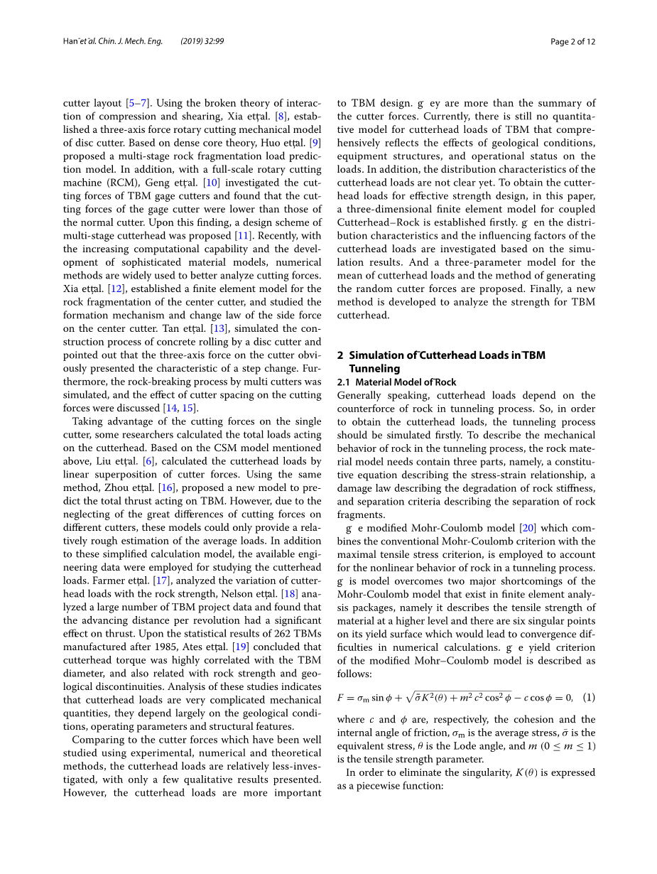 但是,受到封闭和复杂地下的限制在开挖过程中,很难直接观察刀盘的载荷。因此,在早期,切削头载荷的研究主要是通过实验和理论上的研究来进行单刀的切削力。 Roxborough等人考虑到岩石的接触面积和UCS,分析了楔形刀具上的切削力。 Rostami提出了基于线性切割机(LCM)的科罗拉多矿业学院(CSM)力预测模型。它是估算刀具磨损和优化刀具布局的最常用公式之一。Xia等人使用破裂的压缩与剪切相互作用理论,建立了圆盘切割机的三轴力旋转切割力学模型。根据密集核心理论,霍等人提出了多阶段碎石负荷预测模型。此外,Geng等人使用全尺寸旋转切割机(RCM)调查切割TBM量具的切削力,发现量具的切削力低于普通刀具。基于这一发现,提出了一种多级刀盘的设计方案。近年来,随着计算能力的提高和复杂材料模型的发展,数值方法被广泛用于更好地分析切削力。夏等人建立了中心刀岩石破碎的有限元模型,研究了中心刀侧向力的形成机理和变化规律。Tan等人模拟了圆盘铣刀碾压混凝土的施工过程,并指出刀盘上的三轴力明显呈现出阶跃变化的特征。此外,还模拟了多刀破岩过程,探讨了刀距对切削力的影响。