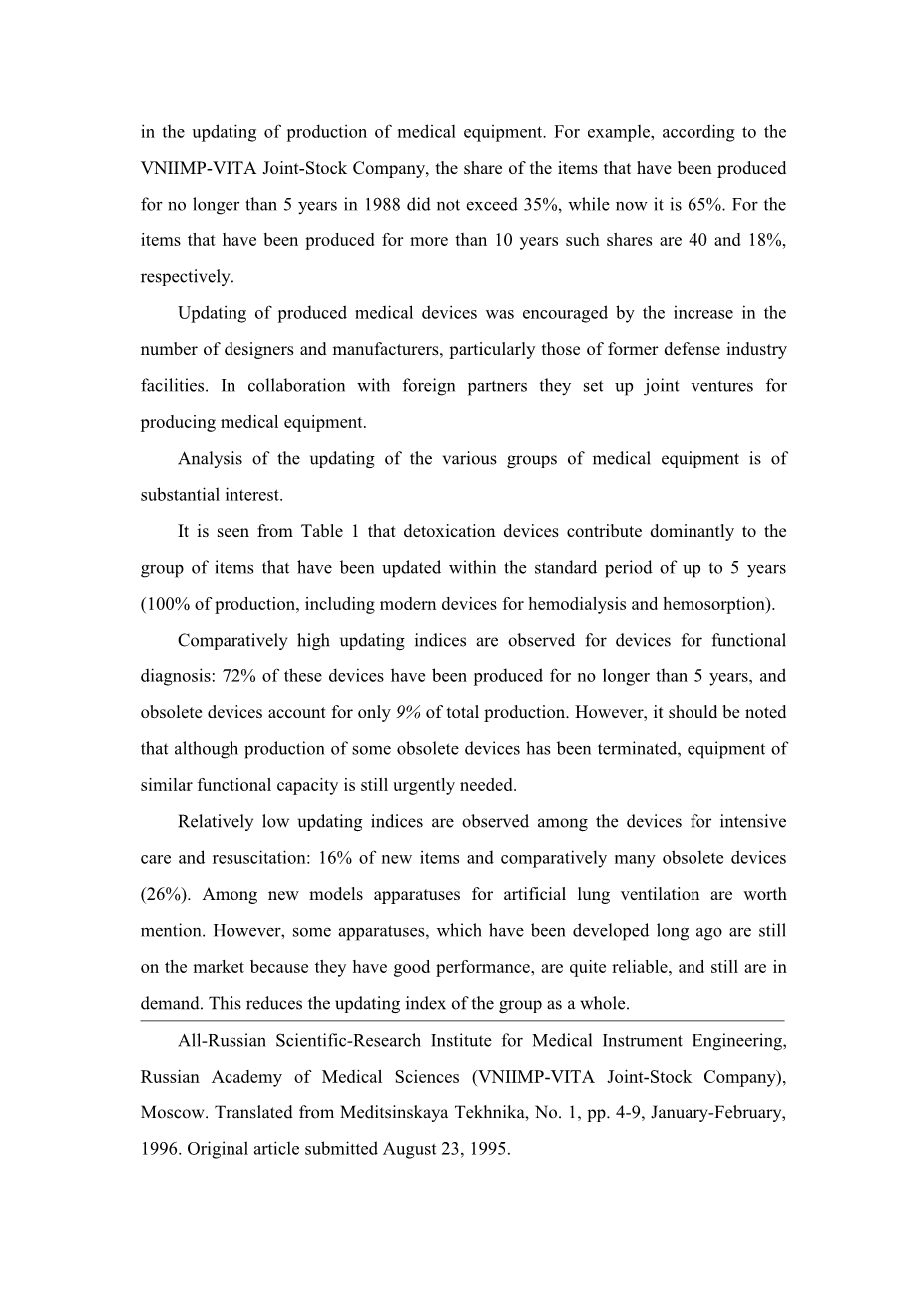 It is seen from Table 1 that in recent years there has been considerable progress in the updating of production of medical equipment. For example, according to the VNIIMP-VITA Joint-Stock Company, the share of the items that have been produced for no longer than 5 years in 1988 did not exceed 35%, while now it is 65%. For the items that have been produced for more than 10 years such shares are 40 and 18%, respectively.