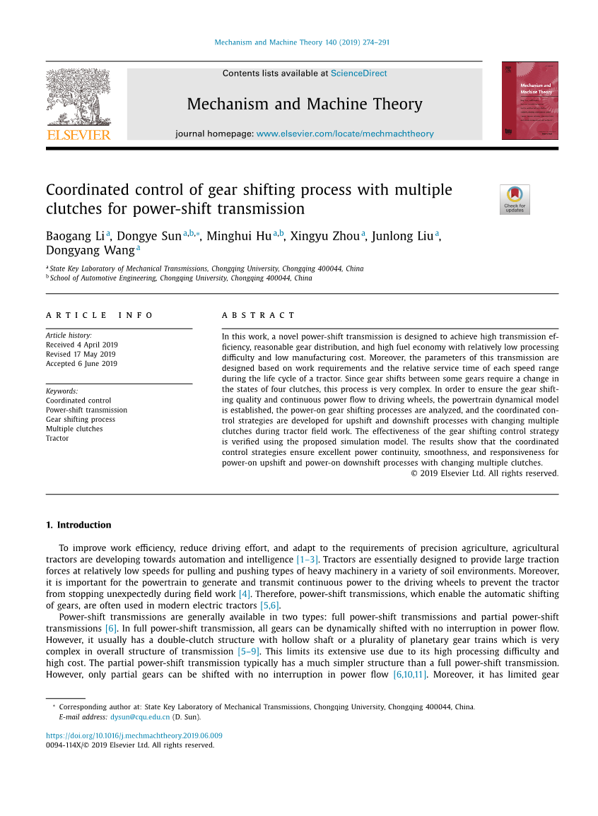 关键词 协调控制;针对传输;换档过程;多个离合器;拖拉机