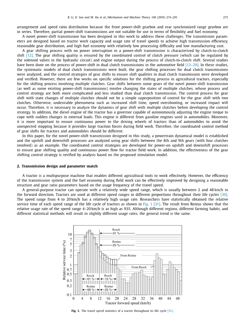 在本工作中,我们设计了一种新型的动力换档传动,以实现高传动效率、合理的齿轮分配、较高的燃油经济性、较低的加工难度和较低的制造成本。根据拖拉机全寿命周期内的工作要求和各速度段的相对使用时间,设计了变速器的参数。由于某些齿轮之间的换挡需要四个离合器状态的改变,所以这个过程非常复杂。摘要为了保证轮系换挡质量和驱动轮的连续功率流,建立了动力系统动力学模型,分析了上、下档过程,提出了拖拉机现场多离合器换挡过程的协调控制策略。通过仿真模型验证了换档控制策略的有效性。结果表明,采用协调控制策略,可以保证切换多个离合器的上、下档过程具有良好的功率连续性、平滑性和响应能力。