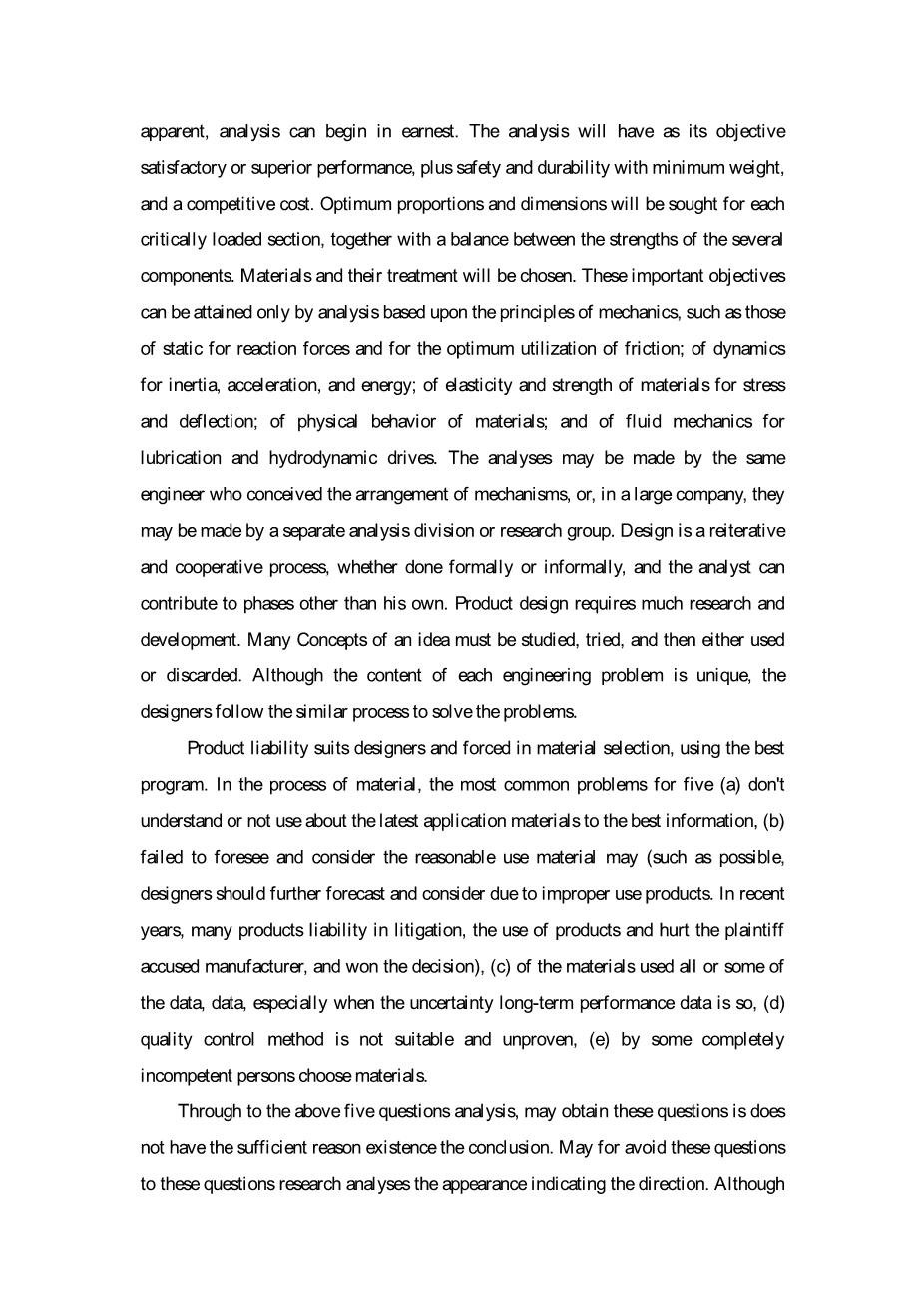 Product liability suits designers and forced in material selection, using the best program. In the process of material, the most common problems for five (a) dont understand or not use about the latest application materials to the best information, (b) failed to foresee and consider the reasonable use material may (such as possible, designers should further forecast and consider due to improper use products. In recent years, many products liability in litigation, the use of products and hurt the plaintiff accused manufacturer, and won the decision), (c) of the materials used all or some of the data, data, especially when the uncertainty long-term performance data is so, (d) quality control method is not suitable and unproven, (e) by some completely incompetent persons choose materials.