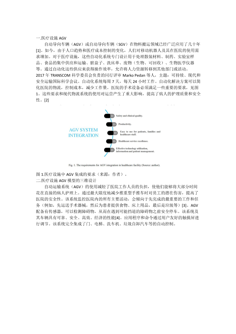Automatic Guided Vehicles (AGV) or self-guided vehicles (SGV), have been widely used in material handling for decades[1] . In these days, the demand for mobile robots and their use in hospitals has increased due to changes in demographic trends and medical cost control. For healthcare facilities, these automated systems are designed specifically for handling bulk material, pharmacy medicines, laboratories samples, central supply and transportation of food, dirty dishes, bed laundry, waste (biological, recyclable), biomedical instruments etc. Operating efficiency is gained by automating these supplies, which allows the transfer of human resources to other departments or activities.
