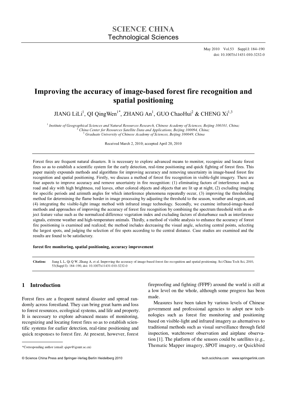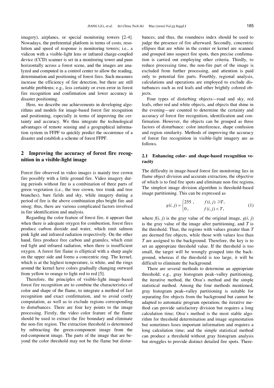 摘 要:森林火灾是经常发生的自然灾害。探索先进的森林火灾监测、识别和定位手段,建立科学的森林火灾早期探测、实时定位和快速扑救体系是十分必要的。本文主要阐述了基于图像识别的森林火灾识别和空间定位中提高精度和消除不准确度的方法算法。首先,我们讨论一种在可见光图像中的森林火灾的识别方法。这里有四种提高火灾识别的精度和消除不准确度的方法:(1)消除干扰因素,例如高亮度的道路和天空、红色的树叶、其他颜色的物体和夜晚明亮的物体;(2)排除重复干扰的特定周期和方位角的图像;(3)通过调整季节、天气和区域阈值,改进图像处理过程中火灾边界的阈值;(4)可见光成像法和红外成像法相结合。其次,研究基于红外图像提高森林火灾识别准确性的方法途径,将光谱阈值与归一化植被指数等目标特征值相结合,排除干扰信号、极端天气、高温动物等干扰因素。第三,研究并实现一种提高森林火灾定位精度的可视化分析方法;该方法包括减小视角,选取中心点,选取最大点,根据中心距离选取火点。