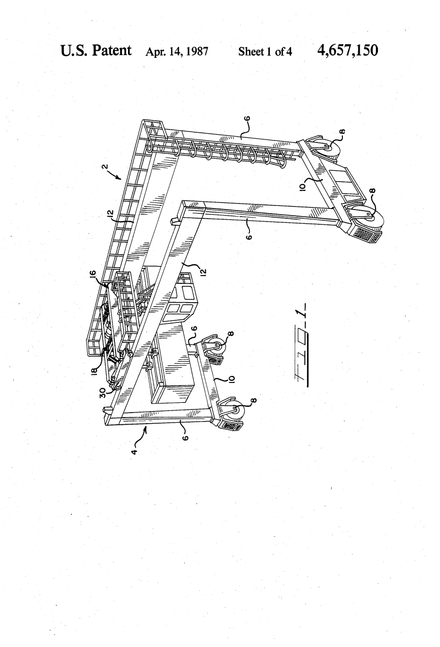 起重机2的结构4包括了四个由各自车轮整体8支撑的支腿6,每个车轮整体8被枢轴连接到下端的支腿6使其能绕垂直轴做旋转运动,起重机2的结构4还包括了一对更长的纵向梁10和一对平行的上横梁12,它决定了被连接到支腿6上的起重机设备梁2的宽度。上横梁12分别支撑着桥架整体16在上面运行的平行轨道14,起升系统18下面悬挂着抓手系统20,在16下面的20上具有许多可以抓取或者卸载一个或多个集装箱的附件装置
