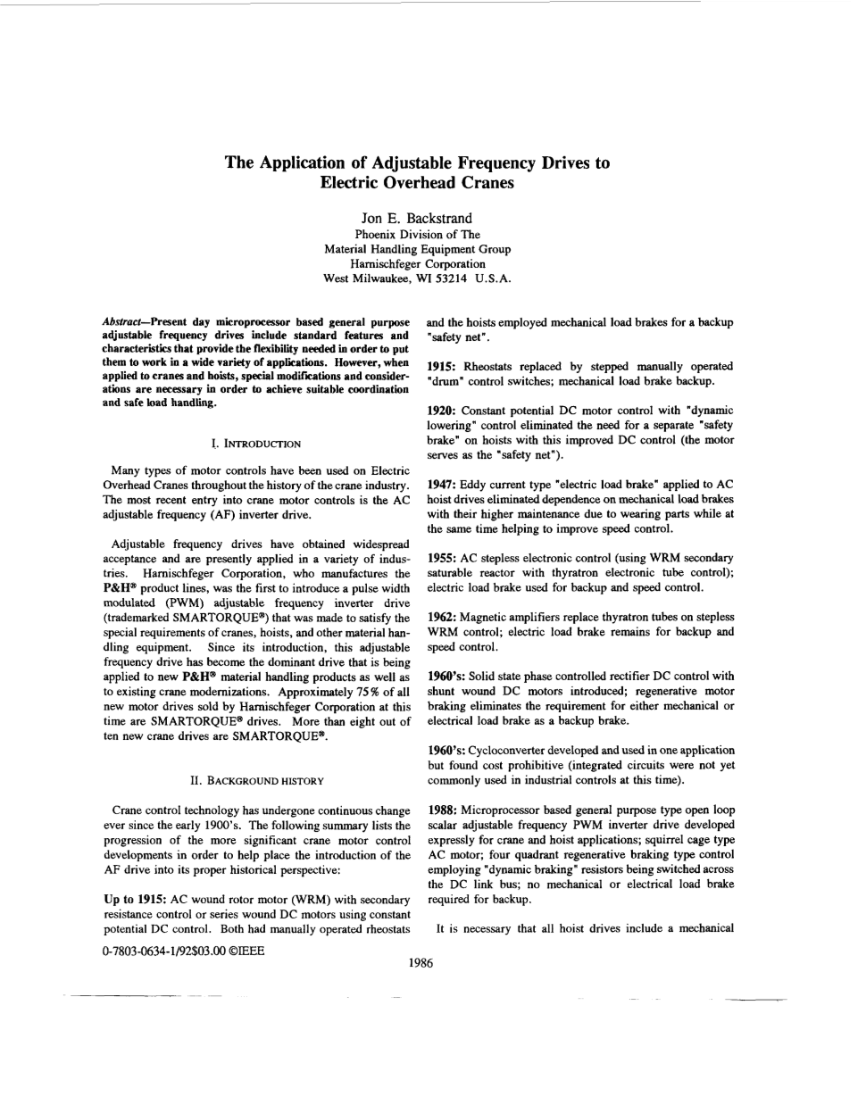 桥式起重机(OHBC)作为一种基本的物料搬运设备,在许多行业中得到了广泛的应用。例如,大型钢厂通常在一个站点上运行几百个桥式起重机。今天,对于桥梁起重机而言,有各种不同的驱动技术可用。但是,由于成本的原因,现代驱动概念并没有得到广泛的实际应用。下面的文章分析了额定负载为10公吨的常规接触器控制的桥式起重机的电气和操作特性。将这种简单的常规控制方法与改造后的起重机的性能进行了比较。本文将详细介绍齿轮箱和电机轴上的机械应力、电网中的峰值电流波动、电力消耗、运行性能和可靠性等方面。本文从只考虑初始投资的角度出发,为现代交流传动系统的评价提供了依据。