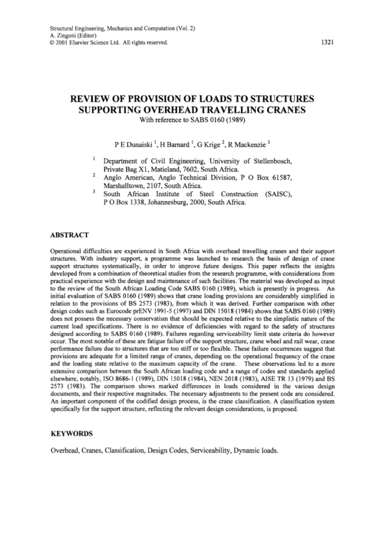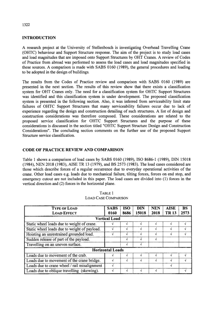 在斯坦伦博斯大学正在进行调查桥式起重机(OHTC)运动和支撑结构响应的研究项目,该项目的目的是研究收集OHTC起重机支撑结构由于负载工况和负载大小引起的性能参数变化。进行海外业务守则的检验,用以评估这些来源指定的工况与负载大小。比较用SABS0160(1989)制成一般操作程序应用到建筑物的设计之中。