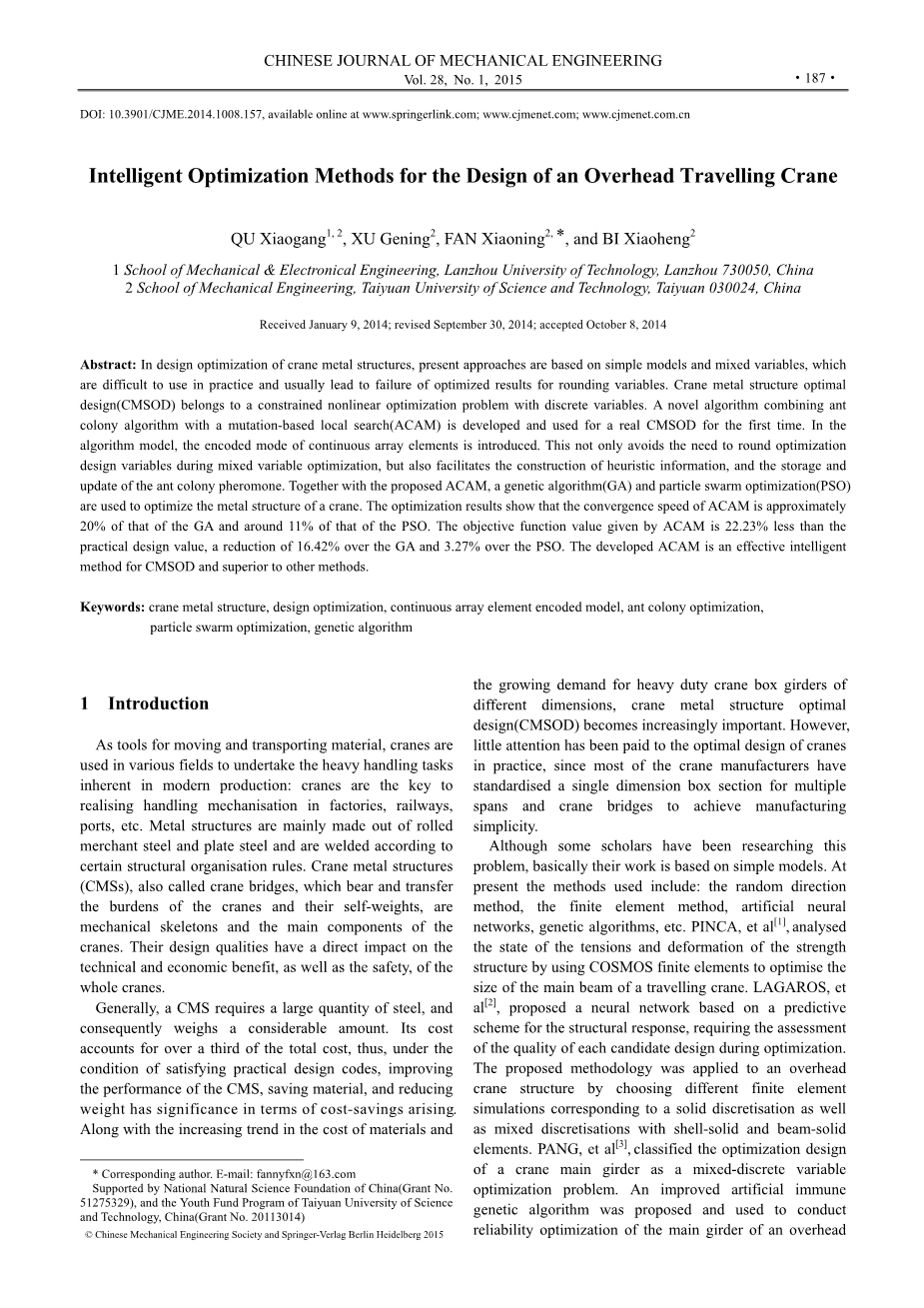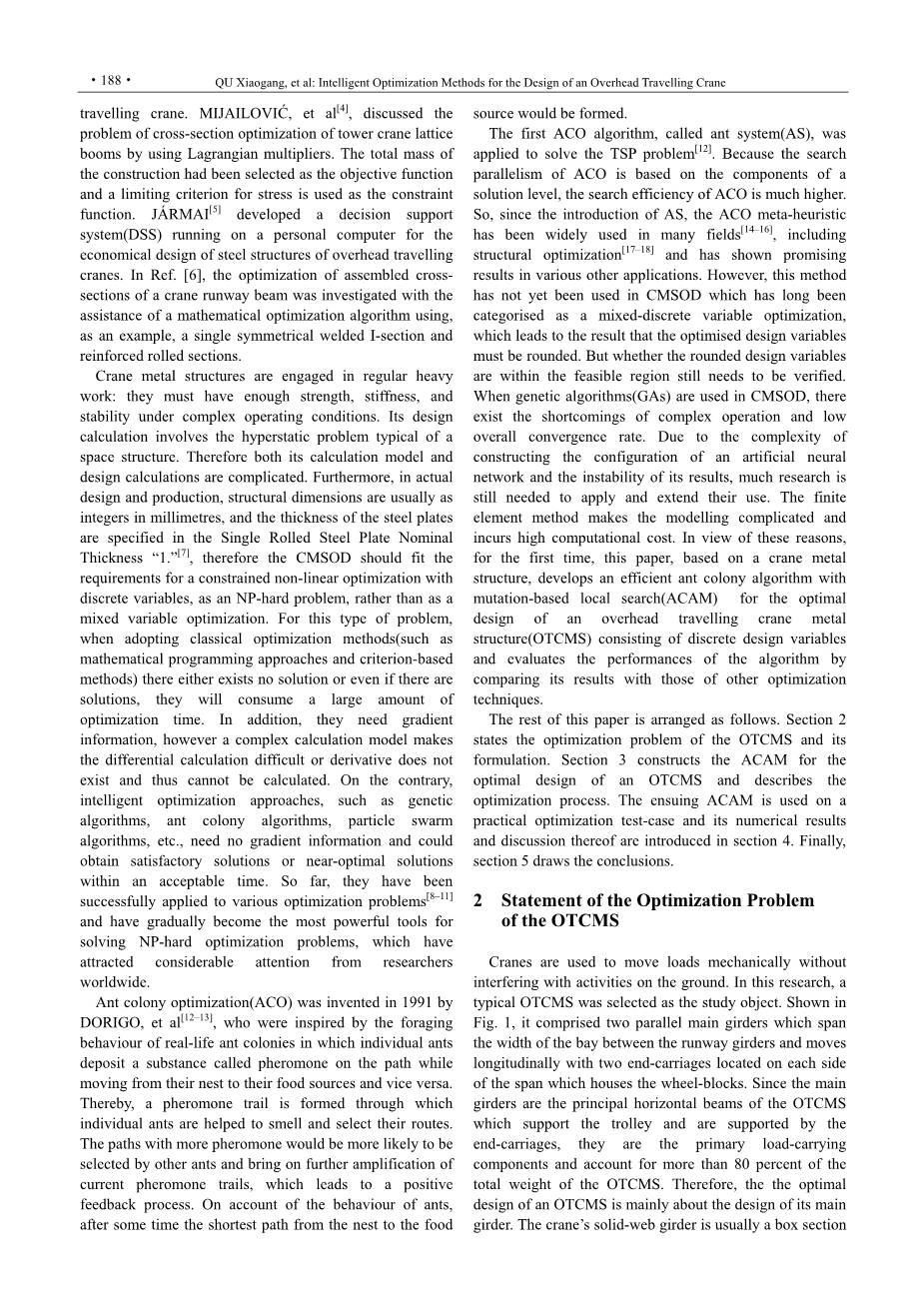 蚁群优化(ACO)是被DORIGO在1991年发明的,灵感来自真实蚁群的觅食行为中个体蚂蚁存款道路上的一种叫做信息素的物质,而从他们的巢穴到食物来源,反之亦然。因此,信息素轨迹形成通过个体蚂蚁帮助气味和路线选择。路径与更多的信息更有可能选择其他蚂蚁,把当前信息素轨迹进一步放大,导致一个正反馈过程。因为蚂蚁的行为,一段时间后,从巢穴到食物的最短路径源将形成。第一个ACO算法,叫做蚂蚁系统,应用于解决TSP问题。因为搜索并行算法是基于组件的解,算法的搜索效率要高得多。所以,引入以来,ACO meta-heuristic已广泛应用于许多领域,包括结构优化和承诺结果在不同的其他应用程序。然而,这种方法还没有用于CMSOD,其一直被归类为一个混合离散变量优化,导致优化设计变量的结果必须是圆形的。但是否圆角设计变量在可行域内还需要验证。当使用遗传算法(GAs)在CMSOD,存在复杂的操作和低整体收敛速度的缺点。由于人工神经网络的构建配置的复杂性和不稳定性,导致许多研究仍需要应用和扩展他们的使用。有限单元法使造型复杂,产生高计算成本。鉴于这些原因,第一次,本文基于起重机金属结构,发展一个高效的蚁群算法,本地搜索(ACAM)的最优化设计的桥式起重机金属结构(OTCMS)组成的离散设计变量和评估算法的性能比较其结果与其他优化技术。