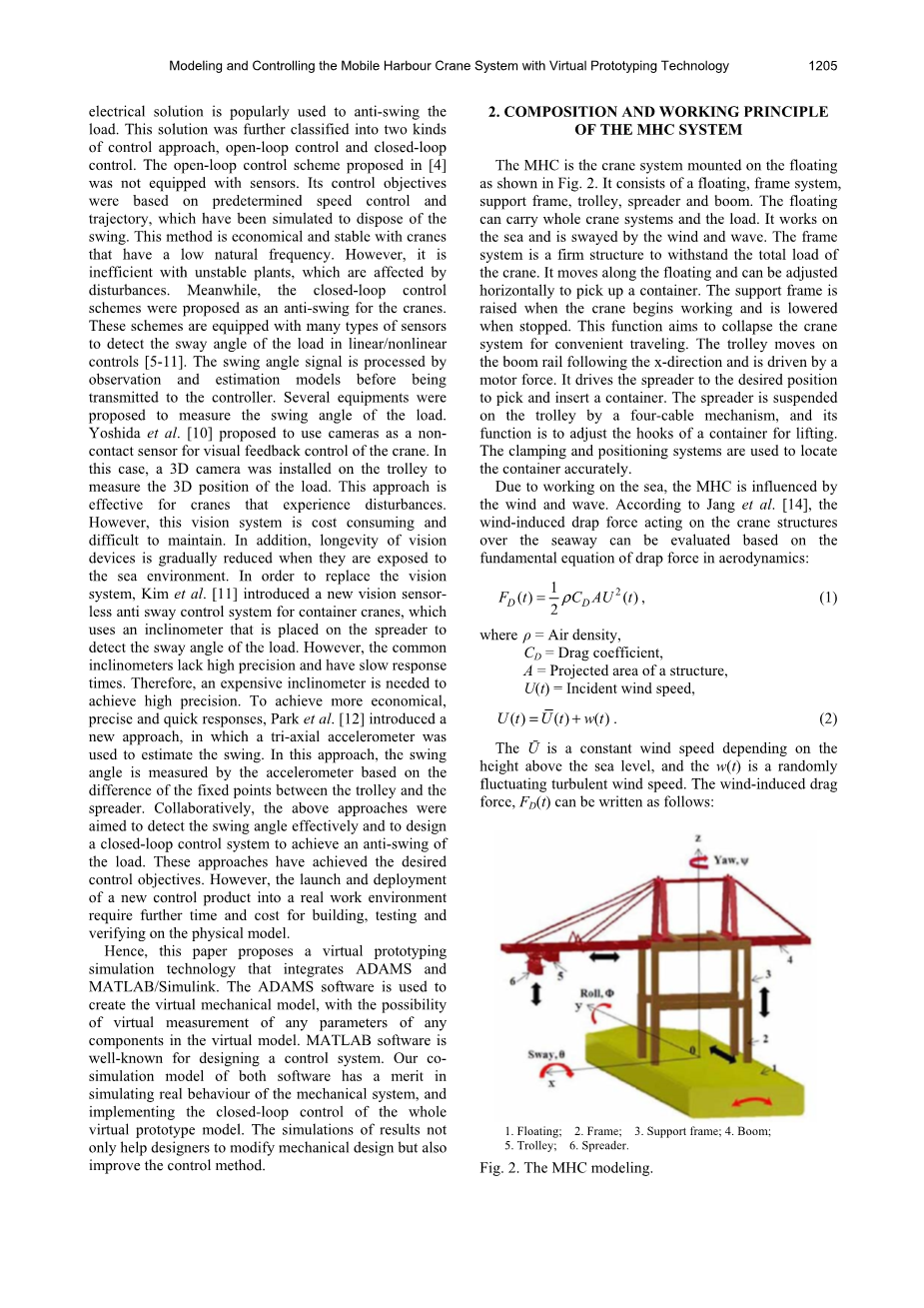 MHC是一种安装在浮动平台上的起重机系统。它由浮动平台,框架系统,支撑架,小车,吊具和主梁组成。浮动平台可以携带整个起重机系统和负载运动。它工作在海上,会在风和海浪的作用下摇摆。框架结构系统是一个能够承受的起重机总负载的稳固结构。它可以沿着浮动平台移动,调整水平位置装卸集装箱。支撑架可以在起重机开始工作时上升,在起重机停止工作时下降。这个功能的目的是在航行过程中降低起重机系统整体高度以方便航行。小车在主梁轨道上沿x方向移动,它由电机驱动。它带着吊具运动到达指定的位置装卸货物。吊具是通过四根钢丝绳悬挂在小车上的,它是用来连接集装箱的。夹紧和定位系统用于对集装箱的精准定位。