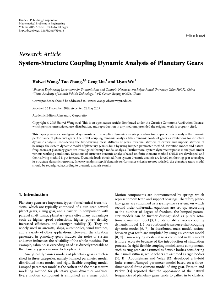 行星齿轮的分析动力学模型可分为三类,即集中参数模型、分布质量模型和刚-柔耦合模型。集总参数模型是最早、最成熟的行星齿轮动力学建模方法。每个运动部件被简化为一个质量点。运动部件由弹簧连接起来,表示啮合齿和支承轴承。因此,行星齿轮被简化为弹簧-质量系统,从而可以进一步建立二阶微分方程来表示系统的动力学模型。根据自由度的数量,集中参数模型可以进一步区分为纯扭转动力学模型,平移-扭转耦合动力学模型,或包括传动轴在内的平移-扭转耦合动力学模型。分布质量模型是将轮齿间的啮合用有限元模型进行简化。由于考虑了啮合过程,在该模型中计算的时变啮合刚度更为精确。在刚-柔耦合模型中,诸如内齿圈全这样的零件都被假定为柔性体,需考虑它们的刚度,而其他零件则被假定为刚性体。abousleiman和Velex在对环形齿轮进行三维有限元模型建立的基础上提出了混合有限元/集中参数模型。他们认为行星齿轮的固有频率呈现一种集中的趋势。在相对较高的频率区域中,有三个固有频率簇被记录。每一个固有频率簇包括一个扭转振动模态,一个横向振动模态,和一个行星振动模态。Parker 和 Wu基于连续离散的混合模型分析了包括弹性内齿圈在内的行星齿轮系统不稳定的相关参数。研究了行星齿轮的振动模态特性,其中有一个特征表明,振动模态有明显不同的运动形式。振动模态分为两类,即清晰的和含混不清的两种模式。之前对行星齿轮的振动机理进行了大量的研究工作,但是,目前还没有很明显的方法来降低行星齿轮传动结构的振动。基于集中参数模型和有限元方法,通过动态负载转移的方式将系统动力学和结构动力学相结合。分析结果表明,所提出的耦合动态分析方法是分析动态特性较为方便的一种方式。通过对该系统和结构的动态性能的分析,从而对行星齿轮的设计起到一定的帮助和指导作用。