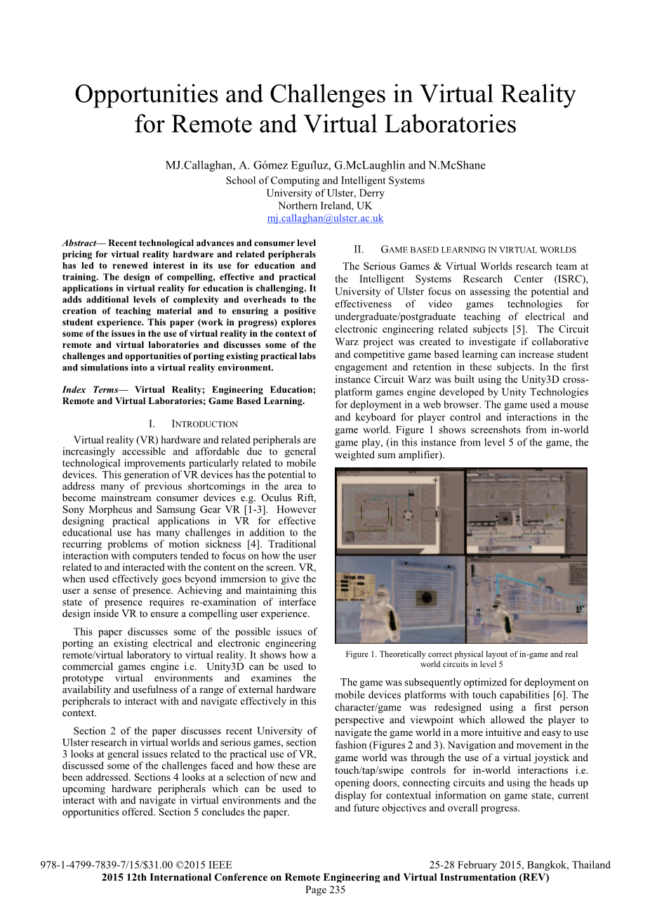 创作教材,确保了学生积极学习。本文(工作正在进行中)探讨一些在使用虚拟现实的问题的情况下远程和虚拟实验室,并讨论了一些移植现有的实际实验室的挑战和机遇和模拟成一个虚拟现实环境。