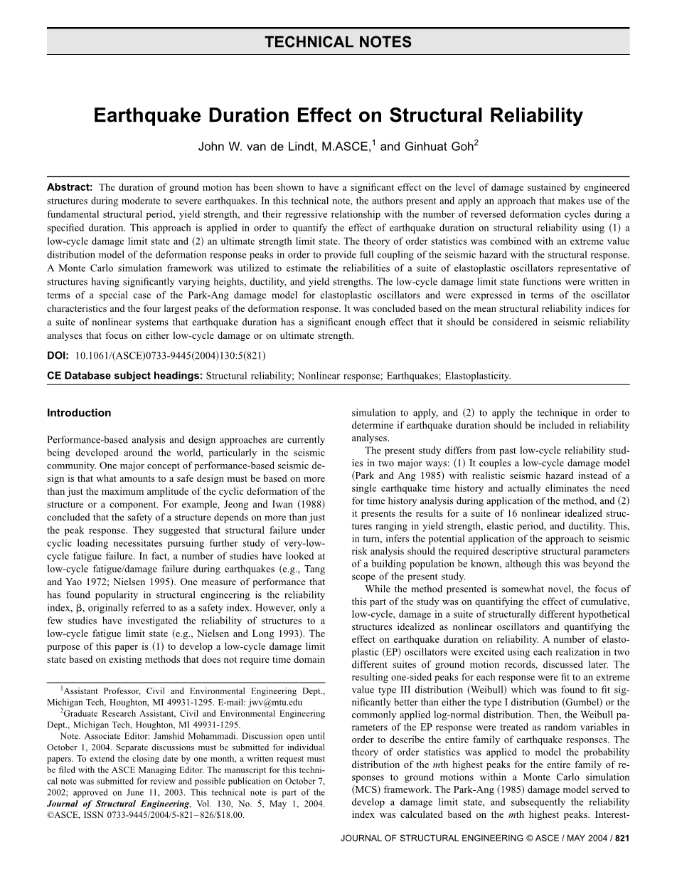 全世界的性能化分析和设计方案目前正处于发展阶段,特别是在地震带地区。一个关于性能化地震设计的主要概念是,一个安全的设计必须不仅仅只基于一个结构或组件周期变形的最大峰值。例如Jeong和 Iwan (1988)总结出的,结构的安全性不仅仅只是取决于峰值响应。 他们指出,结构在周期性载荷下的失效需要进一步研究超低循环下的疲劳失效问题。事实上,已经有许多关于低循环下的疲劳/破坏失效的研究(例如Tang 和 Yao 1972; Nielsen 1995)。一种能找到结构工程中普遍性的性能衡量方式是可靠性指数,beta;,这一指数一开始是被当作安全性指数的。然而,只有一少部分研究调查过在低循环下的疲劳极限状态下的结构可靠性(例如Nielsen 和 Long 1993)。这篇论文的目的在于两点,其一是构建一个基于现有的不需要应用时域模拟的方式的低循环破环极限状态,其二是应用该技术来判定在可靠性分析时,地震的历时是否需予以考虑。