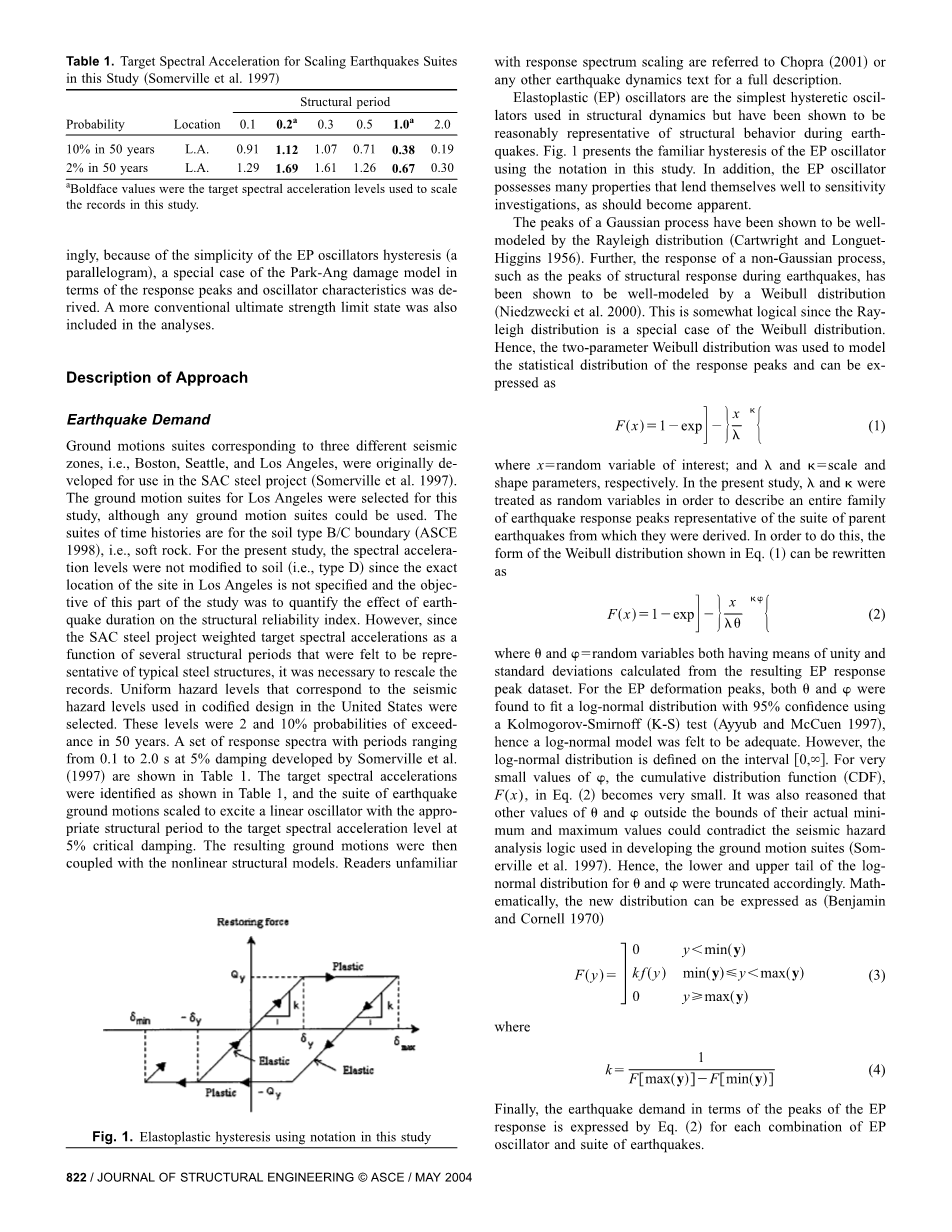 尽管前述的方式有一些新奇,但是这部分的研究关注点在于量化累积的、低循环、破环在一系列不同的假象理想结构中的影响,这些结构被视作为非线性振荡器,并用来量化地震历时对于可靠性的影响。这些弹塑性(EP)振荡器会利用两套地面运动的记录来实现其激励,这点之后再讨论。对于每一个响应的单边峰值都符合极值III型分布(韦伯),这种分布被发现明显要好于I型极值分布(冈贝尔)和被普遍应用的对数正态分布。EP响应中的韦伯参数将被视作为随机变量以描述整簇的地震响应。次序统计的原理会被用来建立在蒙特卡洛模拟(MCS)框架之内,地表运动的整簇响应第m个最高峰值的概率分布模型。而Park-Ang(1985)破坏模型被用来建立一个破坏极限状态,随后,基于第m个最高峰值,可以计算出可靠性指数。有趣的是,由于EP振荡器滞后作用(一个平行四边形)的简单性,能得出Park-Ang破坏模型的特殊情况将会以响应峰值和振荡器特征的形式呈现出来。
