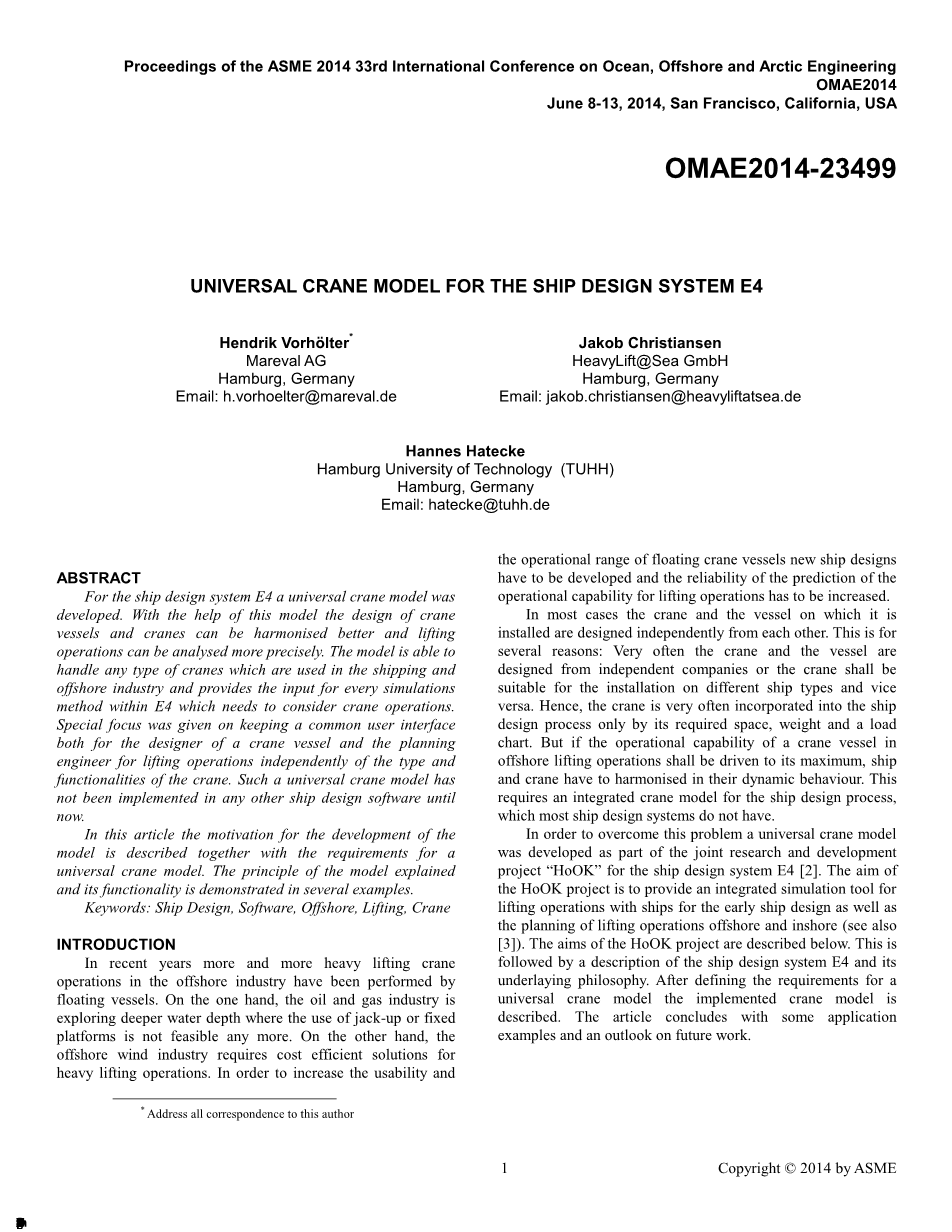 本文研究了针对船舶设计系统E4的通用起重机。在这个起重机模型的帮助下,船舶和起重机能够更加协调,起升过程也可以更精确地分析。该模型能模拟任何船舶海洋工业用起重机并且提供各种在E4系统中起重机的运动学仿真。特别关注的是:为设计师设计起重机和工程师规划吊装作业,保持共同的用户界面。目前,这样一种通用型起重机还没有在其他的船上实现过。
