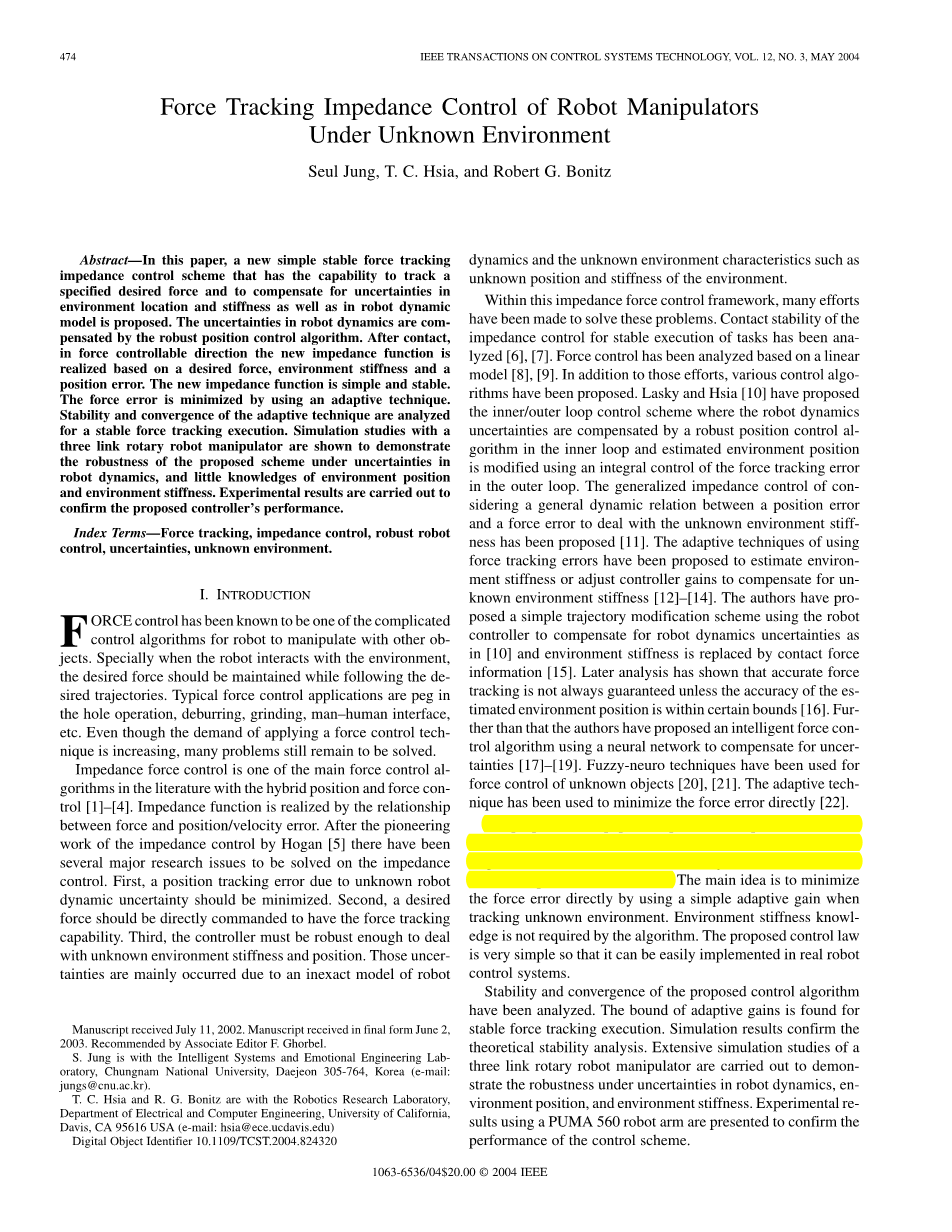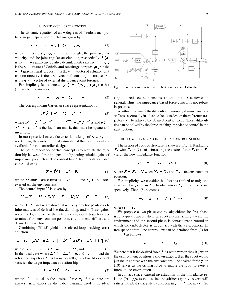 在阻抗控制架构中,付出了很多努力去解决这些问题。为了稳定的任务执行,接触稳定性已经有所分析[6],[7]。基于线性模型分析力控制[8],[9]。除了这些努力,各种控制算法已经被提出。Lasky和Hsia[10]提出内外环控制组合,其中机器人动力学不确定性通过一种鲁棒位置控制算法在内环中补偿掉,同时估计的环境位置通过运用一种对力跟踪误差积分控制来改善。提出了考虑位置误差和力误差之间的一般动态关系以处理未知环境刚度的广义阻抗控制[11]。力跟踪误差的自适应技术已经被提出