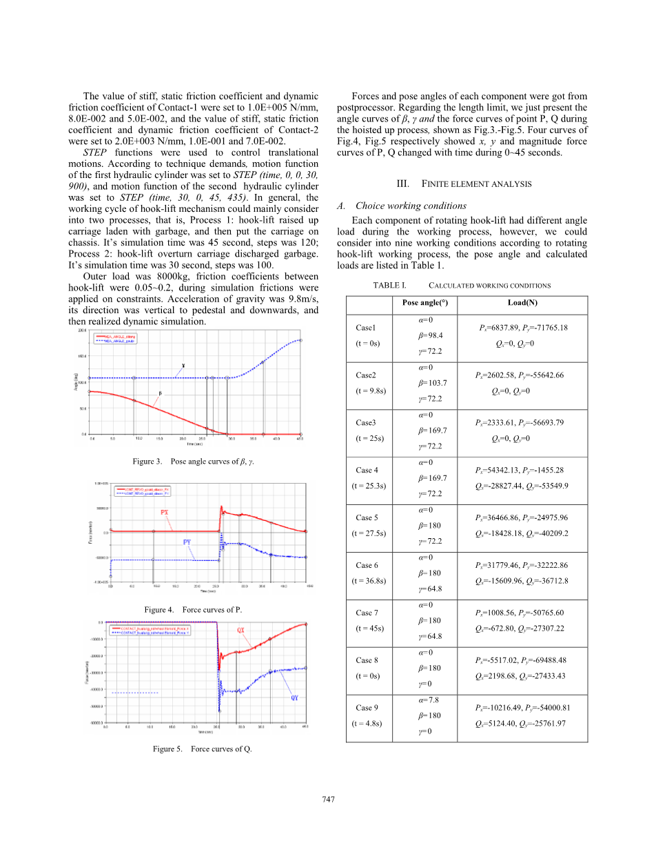 从后处理中得到了每个构件的力和摆角。关于长度的限制,在车厢提起的过程中,我们只是提出beta;和gamma;角度曲线和点P,Q的受力曲线,正如图3到5所示。图4和图5的四条曲线分别显示了x,y和P、Q的受力曲线在0~45秒内随时间的变化。