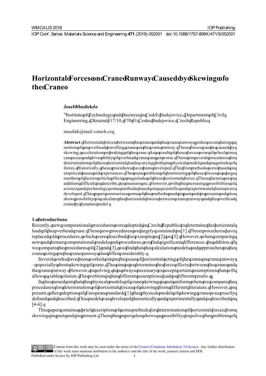 最近,捷克共和国采用了新的计算程序来确定桥式起重机的水平载荷。这些新程序主要包含在[1]中。这些程序已经取代了旧程序,例如[2]或[3]中所述。但是,在比较新的和以前的计算模型和程序时,我们发现了显着的差异。此外,如果我们比较[2]和[3]的程序,我们发现起重机作用在起重机跑道上的计算模型和方法也有很大差异。
