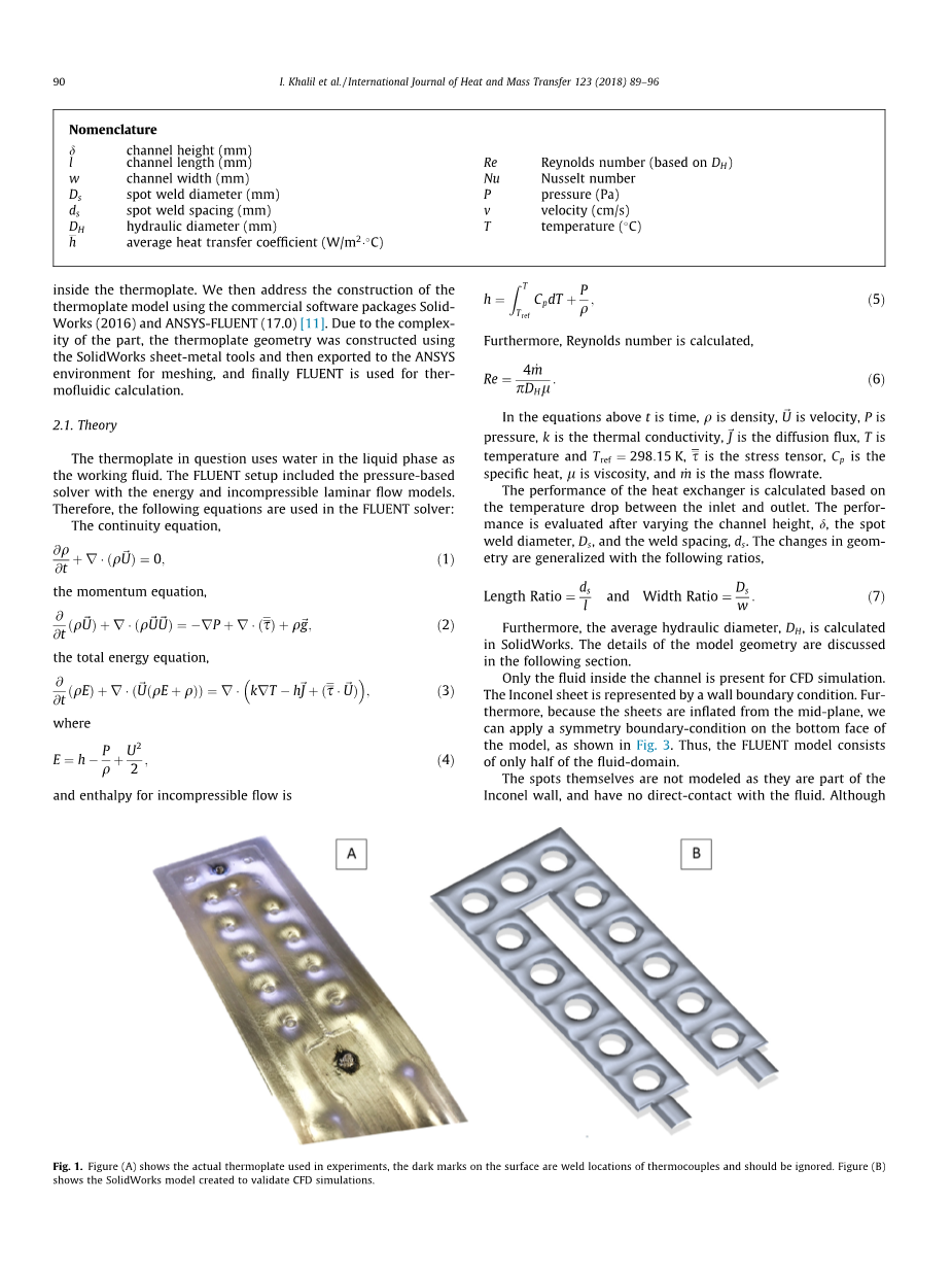 本研究的主题是由两片 Inconel 625 缝线焊接在一起的热板, 其中的点焊模式沿流体方向分布, 如图1所示。板材之间的空间通过使用平行板导轨将其液压扩展到已知厚度。该装置在液相中使用一种脊髓流体。这种特殊的热交换器是一个更大的设计的原型测试部分, 用于 specialized 的集中太阳能接收器。这种应用需要一个紧凑的, 可变形的轮廓具有较高的运行效率和最小的温度梯度之间的辐照壁和传热流体。初步设计利用水作为工作流体, 层流从0.5 到 5.0 g, 压力范围从1到50巴, 出口温度为 80–250 c。