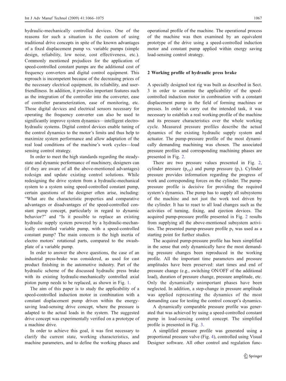 现有的液压机械控制轴向柱塞泵由恒定内啮合齿轮泵(PGF3 31 / 032RE07VE4,Bosch-Rexroth)取代,由一台15千瓦的速度控制感应电机驱动,该电机将用于新的驱动概念。电动机由适当的变频器(Midimaster vector 6SE32,Siemens)驱动[12]。该泵提供等效长度和尺寸的液压管道系统(相当于液压容量和电感[9]),并且对应于现有的压弯机管道系统。