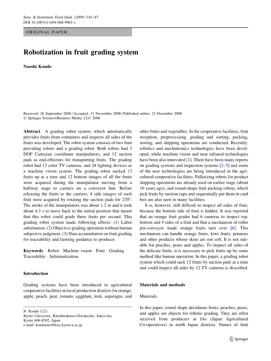 在本文中,圆形落叶水果、桃、梨和苹果是机器人分级的对象。它们通常是从日本北部地区的 JA(日本农业合作社)的生产者那里收到的。水果名称分别为“晓”(桃)、“小水”、“丰水”、“二生生”、“南水”(梨)、“北竹津轻”、“ San-Tsugaru、Yohkoh、Ohrin、Yuhtai-Fuji 和 San-Fuji(苹果)。这些水果具有不同的颜色、质地和形状,如图 1。在 JA 中,一天的最大接收水果量为 100 吨,这意味着如果假设一个水果,则每小时需要处理 35,714 个水果。重 350 克,分级系统一天工作 8 小时。通常在一天内对几种水果进行分级。