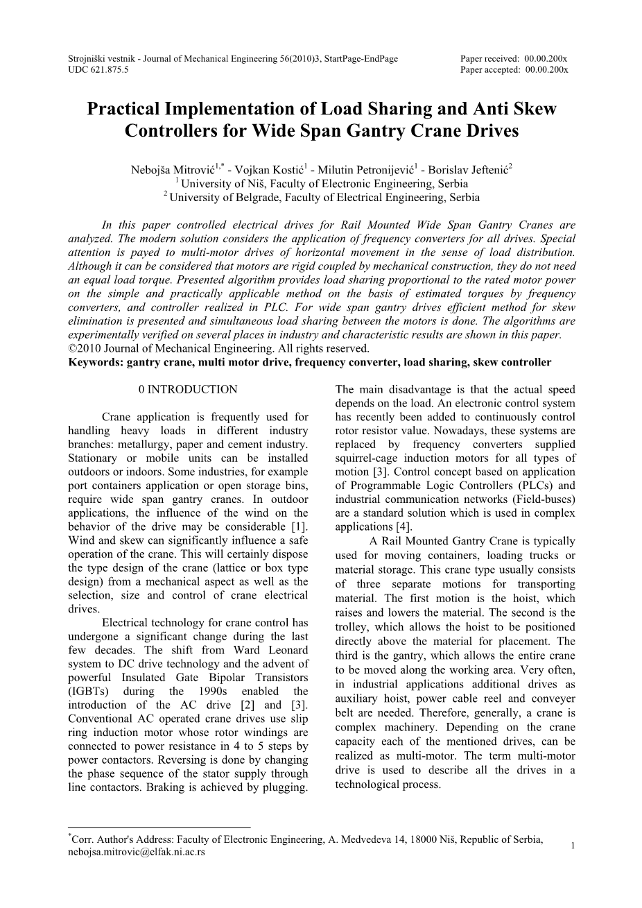 本文对轨道式大跨度门式起重机的控制电气传动进行了分析。现代解决方案考虑了变频器在所有传动装置中的应用。从负荷分配的角度出发,对多电机水平运动的驱动进行了研究。虽然可以认为,电机是刚性耦合的机械结构,他们不需要一个平等的负载扭矩。该算法以变频器的转矩估计值为基础,采用简单实用的方法,在PLC中实现控制器,实现了与电机额定功率成比例的负载分配。针对大跨度龙门传动,提出了一种有效的斜交消除方法,实现了电机间的负载共享。本文在工业上的多个地方对算法进行了实验验证,并给出了其特点。
