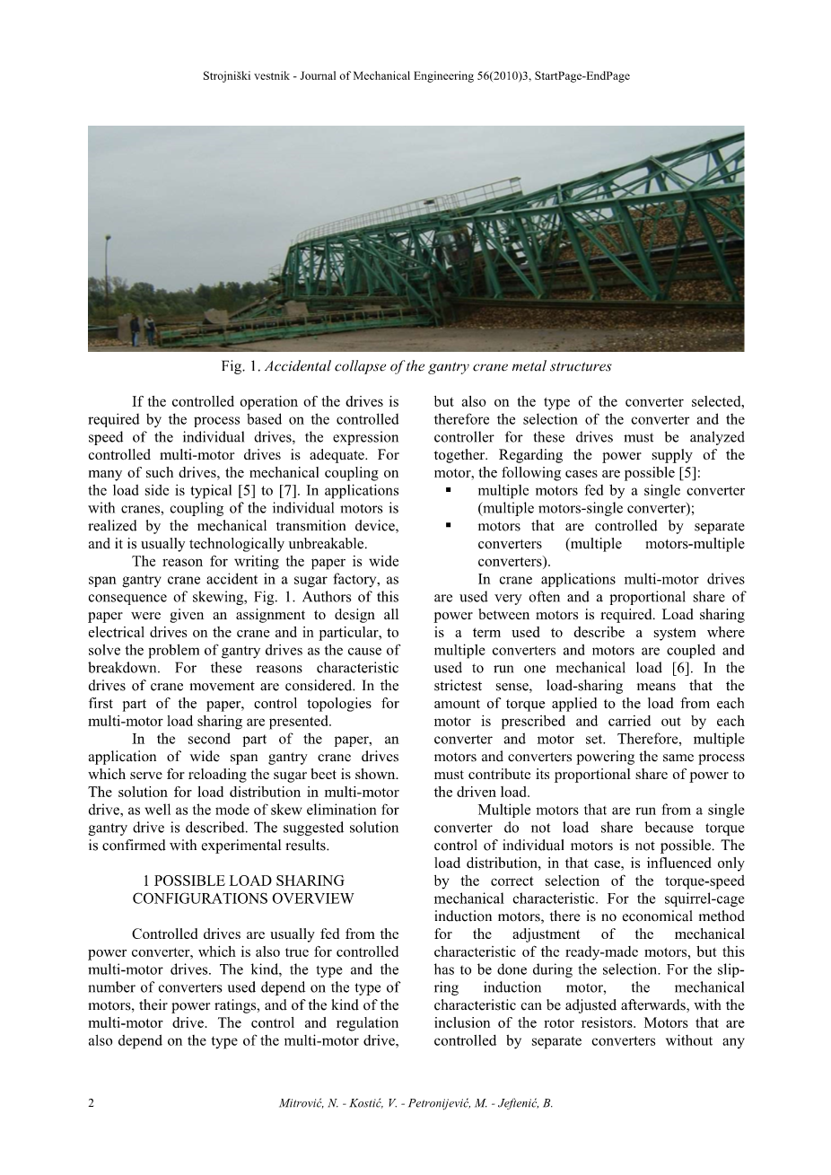 如果过程需要根据单个驱动器的控制速度对驱动器进行控制操作,则表达式控制的多电机驱动器就足够了。对于许多这样的驱动器,负载侧的机械耦合是典型的[5]到[7]。在起重机的应用中,单个电机的耦合是通过机械传动装置实现的,而且通常在技术上是不可破坏的。写这篇论文的原因是一家制糖厂的大跨度门式起重机事故,由于倾斜,如图1所示。本文作者的任务是设计起重机上的所有电气传动装置,特别是解决龙门传动装置作为故障原因的问题。基于这些原因,考虑了起重机运动的特征驱动。本文第一部分提出了多电机均载控制拓扑。第二部分介绍了大跨度门式起重机驱动装置在甜菜装载中的应用。介绍了多电机传动中的负荷分配问题,以及龙门传动的斜交消除方式。建议的解决方案与实验结果一致。