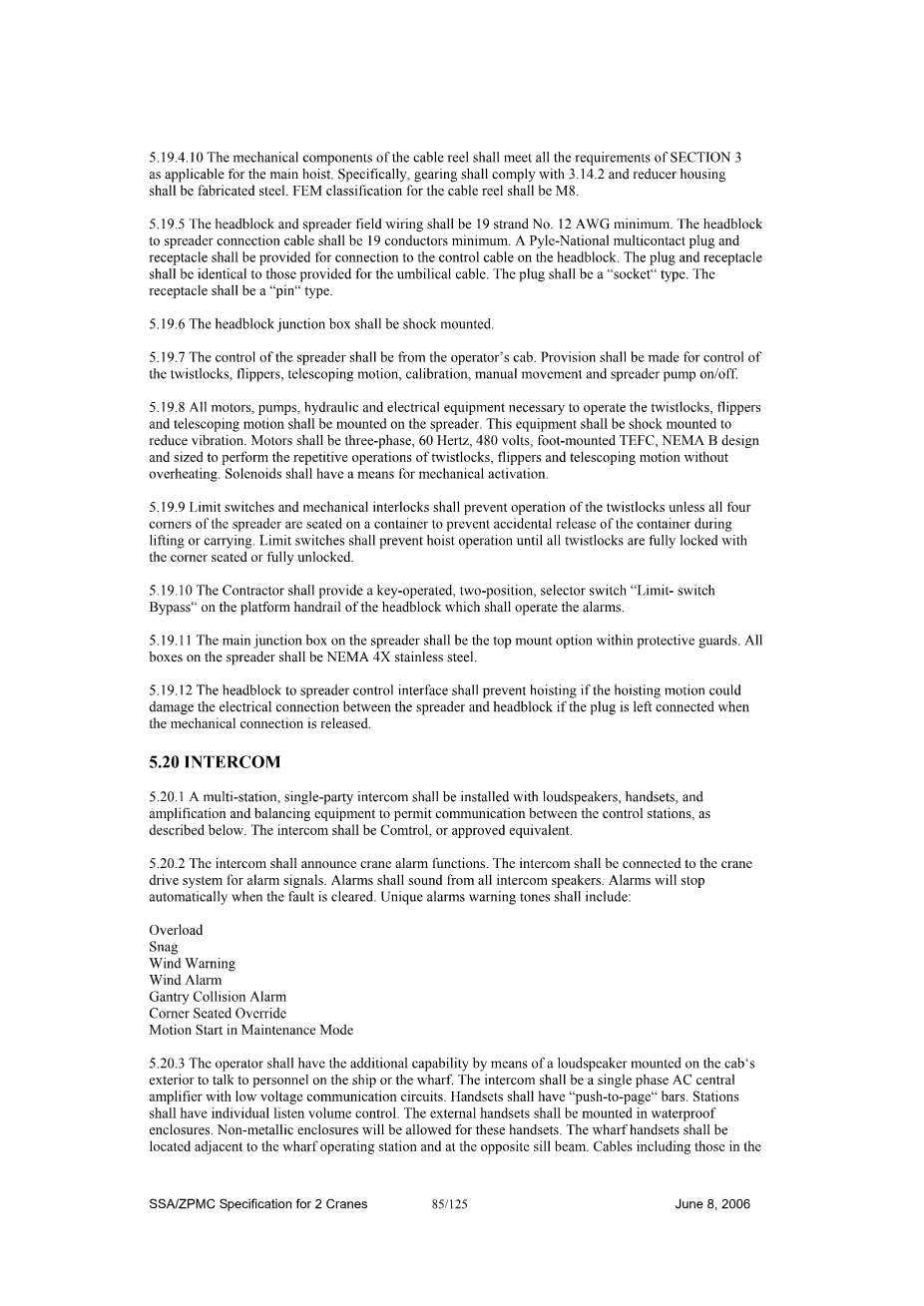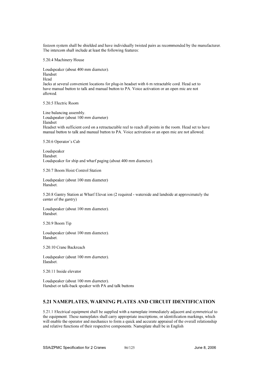 5.20.3操作员应通过安装在驾驶室外部的扬声器与船上或码头上的人员交谈,以获得额外的能力。对讲机应为具有低压通信电路的单相交流中央放大器。手机应具有“按页”条。电台应具有单独的听音量控制。外部手机应安装在防水外壳中。这些手机将允许使用非金属外壳。码头手机应位于码头操作站附近和相对的门槛梁上。包括SSA / ZPMC规范的2个起重机86/125 2006年6月8日花边系统中的电缆应按照制造商的建议进行屏蔽并具有单独的双绞线。对讲机应至少包括以下功能: