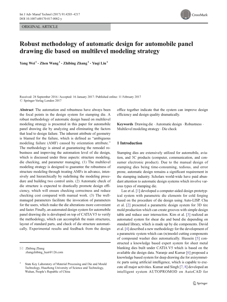摘要自动化和鲁棒性一直是冲压模设计系统的重点。本文通过分析和消除导致设计失败的因素,提出了一种基于多级建模策略的鲁棒自动设计方法。几何的固有属性被归咎于失败,其被定义为“由取向属性引起的模糊建模失效(AMF)。”该方法旨在保证改造鲁棒性并提高模具设计的自动化水平,这在下面讨论。三个方面:结构建模,模具检查和参数管理。(1)多级建模策略旨在通过重新定义建模过程和构建两个控制单元,通过预先,集中和分层处理AMF来保证结构建模的鲁棒性。(2)模具结构的自动检查有望大大提高设计效率,与手工作业相比,可以保证检查的正确性,降低检查成本。(3)良好的管理参数有利于用户调用参数,使模具更改更方便,更快捷。最后,在CATIA V5 的基础上开发了汽车面板拉丝模自动化设计系统,验证了该方法,可以实现主要结构,标准件的布局,自动检查模具结构。实验结果和设计反馈。