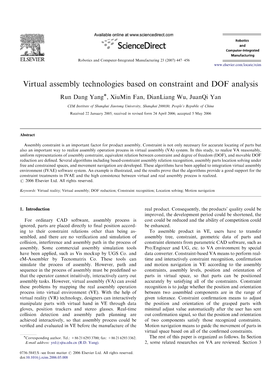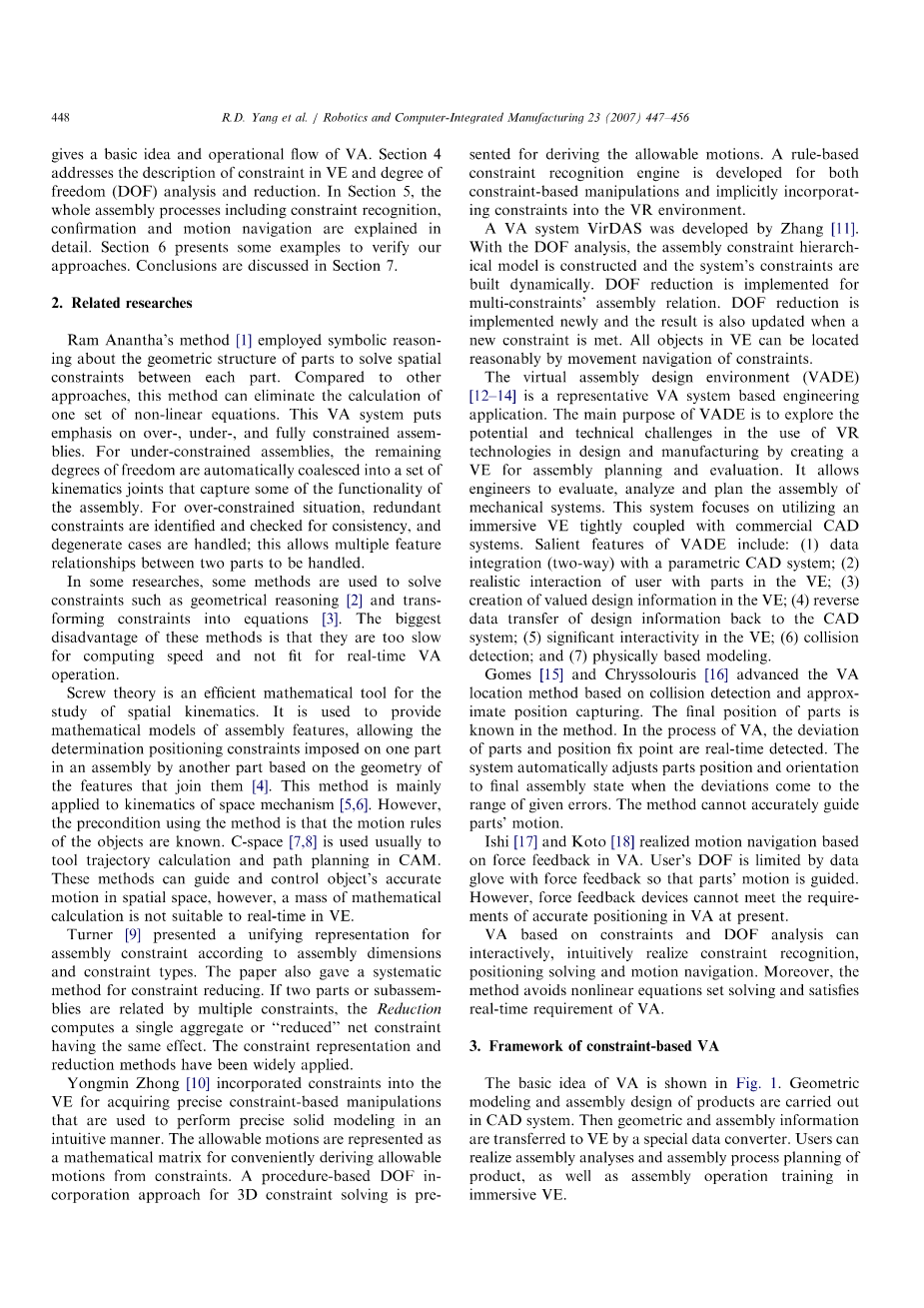 本文的其余部分组织如下。第二部分对虚拟装配的相关研究进行了综述。第3节给出了虚拟机的基本思想和操作流程,第4节描述了虚拟机中约束的描述以及自由度分析和约简。第五节详细介绍了约束识别、确认和运动导航等装配过程。第6节提供了一些例子来验证我们的方法。结论将在第7节中讨论。