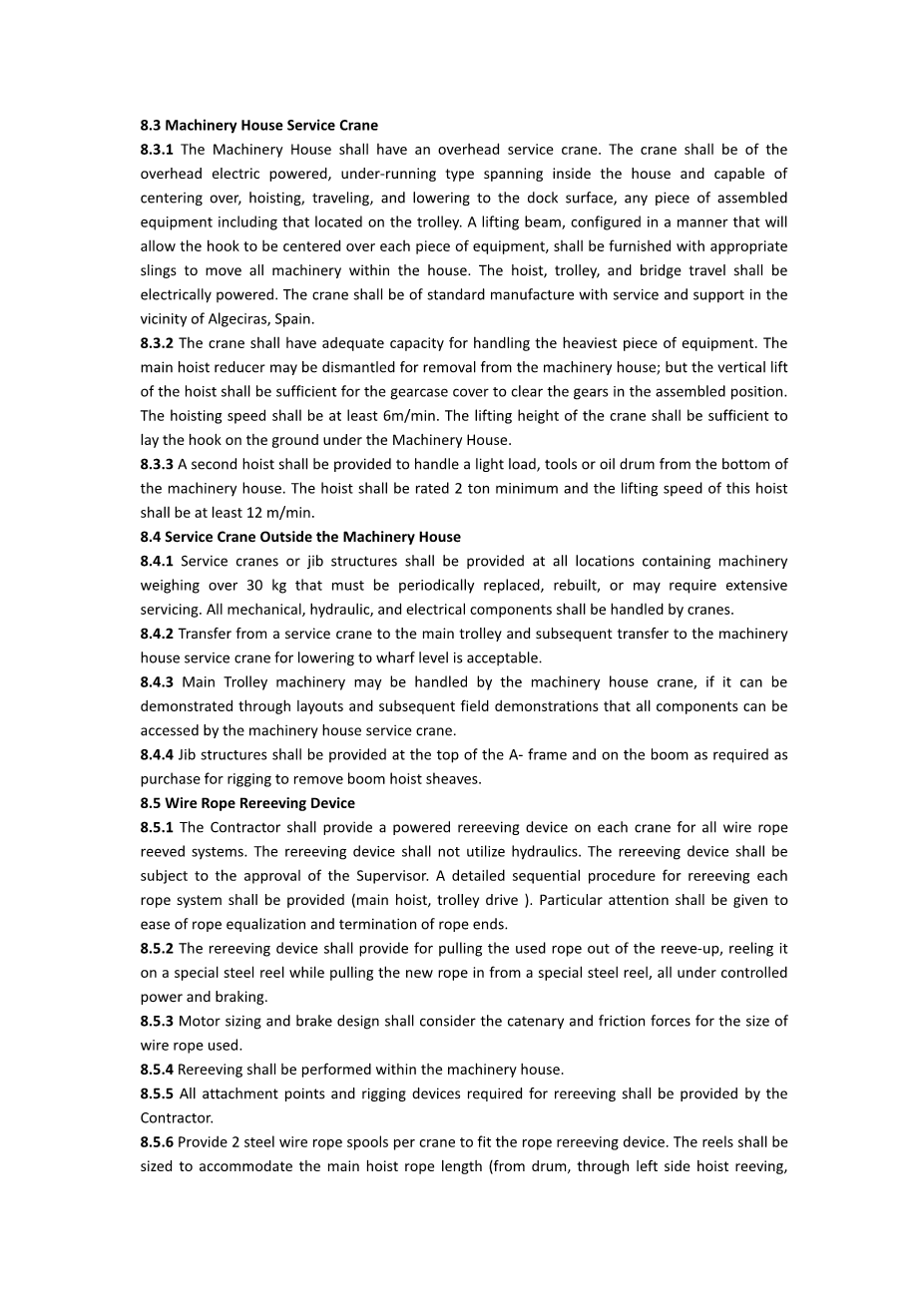 8.3.1机房应配备高架服务起重机。起重机应为架空电力,地下运行式,在机器房内横跨, 能够对中、起重、移动和下降到船坞表面以及任何组装设备,包括位于小车上的设备。起重吊梁的配置方式应允许吊钩位于每个吊梁的中心。设备应配备适当的吊索,以移动所有机器房内的机器。起重机、小车和桥梁行程应为电力驱动。起重机应为标准制造并得到来自西班牙阿尔赫西拉斯的支持和服务。
